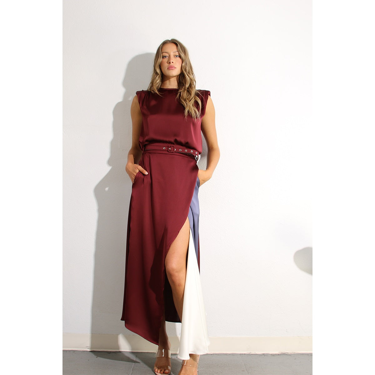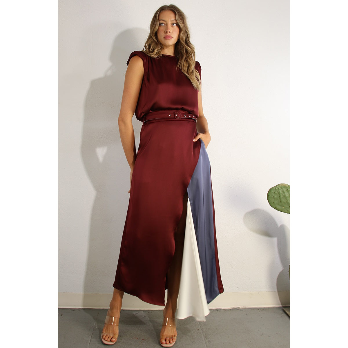 This ensemble features a padded shoulder top paired with a color block skirt that includes a front slit and a coordinating belt. Ideal for occasions such as baby showers, weddings, or elegant date nights. The model is 5'8" with measurements 34C bust, 26" waist, and 34" hips, wearing a size Small. Crafted from 100% polyester for a refined and comfortable fit.