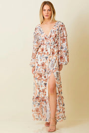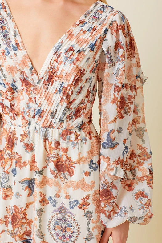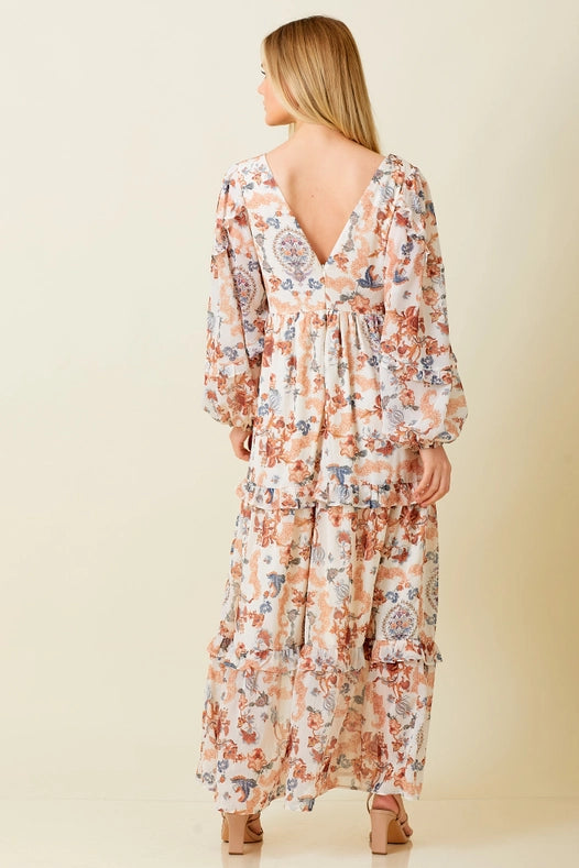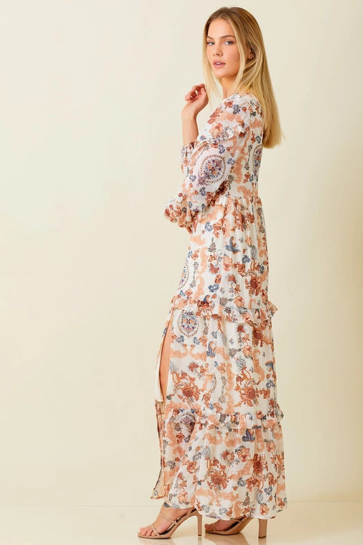 Effortlessly elegant, this maxi dress features a captivating paisley print and charming pleated ruffles. The back zipper ensures a secure fit while the side slit adds a touch of allure. Perfect for any occasion, dress it up or down with ease.