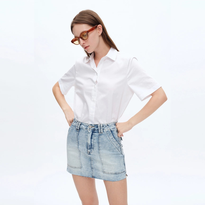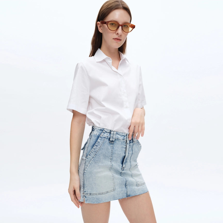 Expertly crafted from comfortable stretch denim, the Pencil Denim Mini Skirt with Raw Hem is perfect for any season. With its utility style and four pockets, this denim skirt not only adds a touch of natural washed effect, but also offers practicality with a zipper fly and pencil style. Machine washable for easy care, this skirt is made from 65% cotton, 10.5% viscose, 23.5% polyester, and 1% spandex for ultimate comfort and stretch.