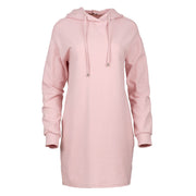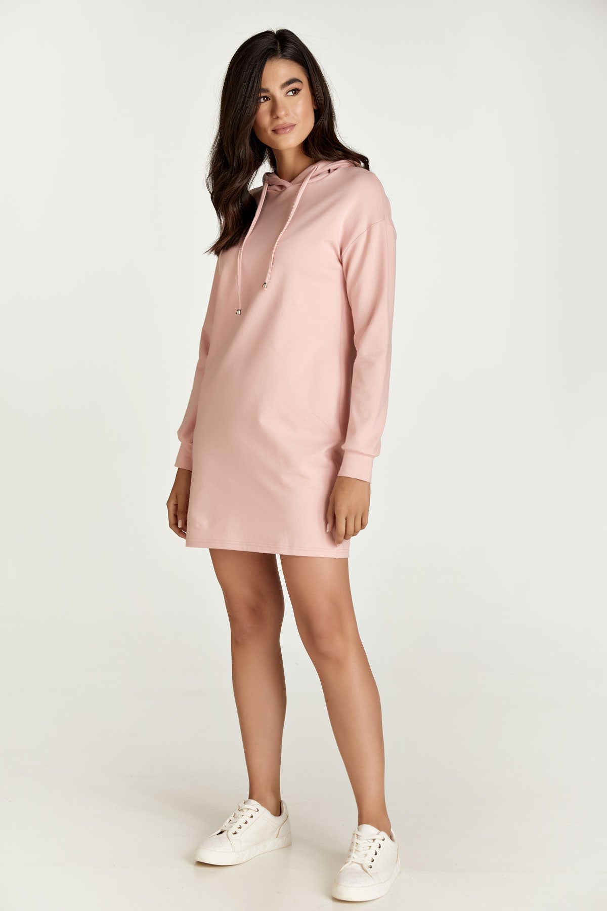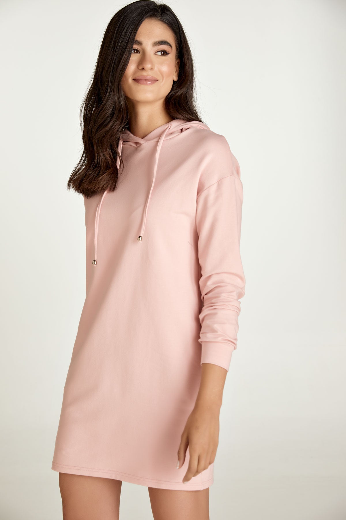 This pink hooded mini dress is crafted in stretch jersey fabric: cotton-elastane. A tie in the same fabric runs internally through the hood and there are two silver metal stoppers at the ends. It has long sleeves with cuffs. The dress is styled in a straight loose fitting silhouette.