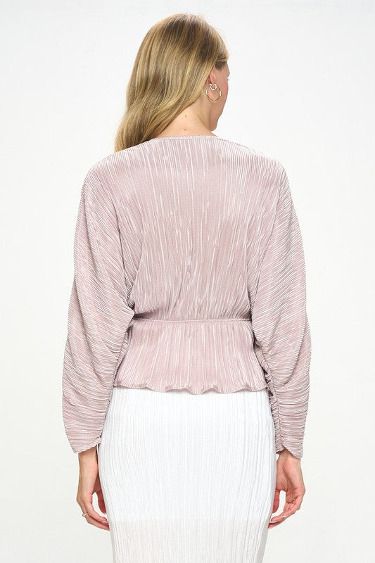Plisse V neck Top with Balloon Dolman Sleeve
