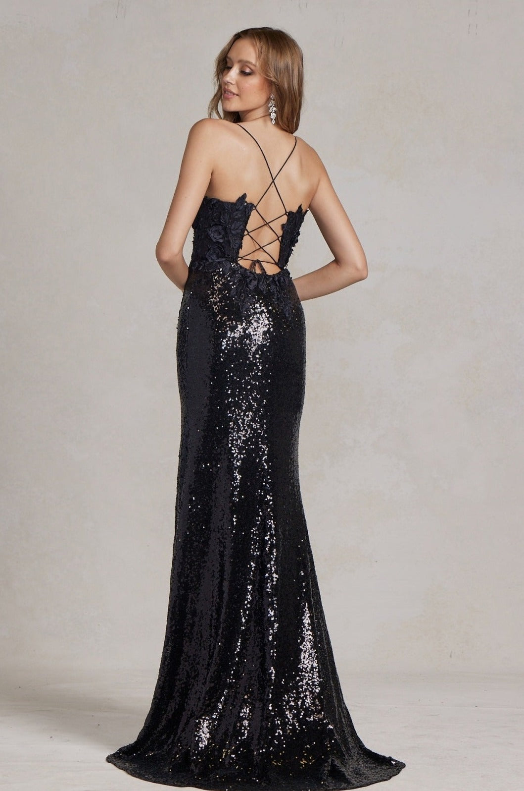 Effortlessly glide across the stage in this exquisite dress, expertly crafted by Nox Anabel R1207. Featuring a deep V-neckline with mesh detailing and delicate skinny straps, prepare to dazzle in every step.