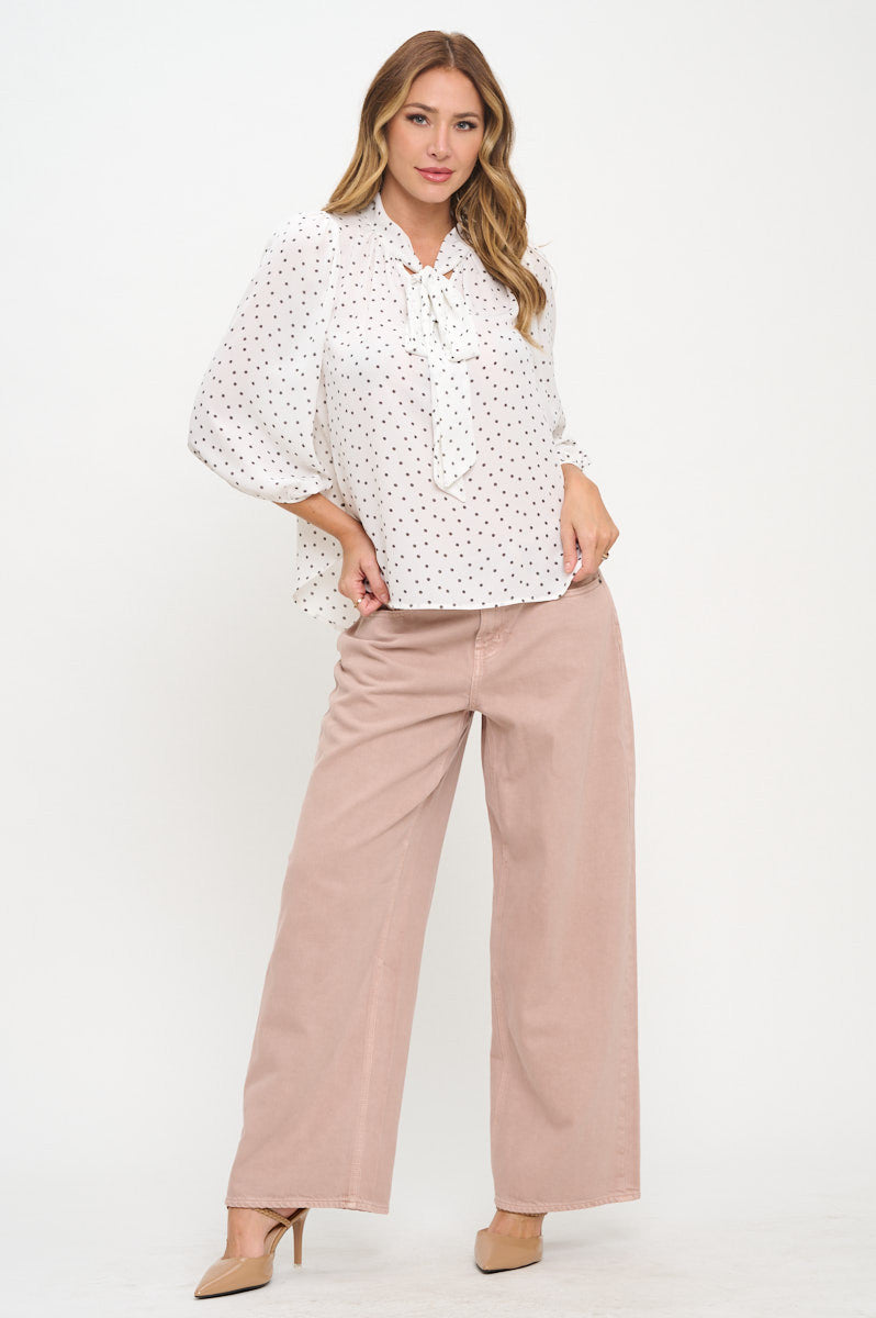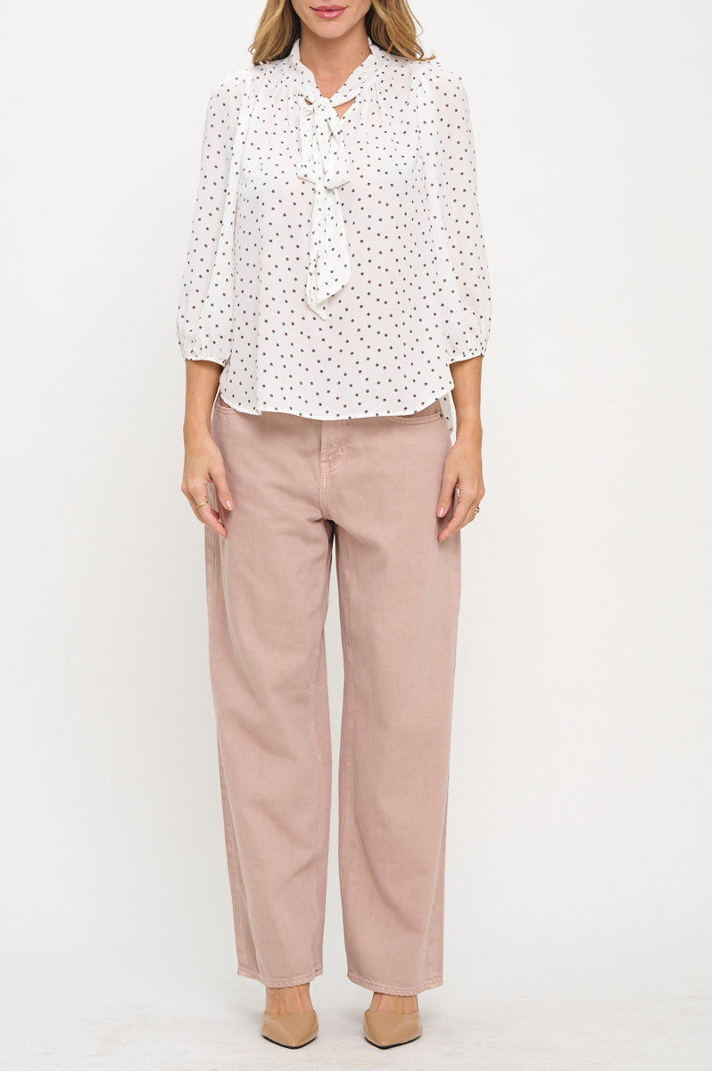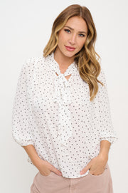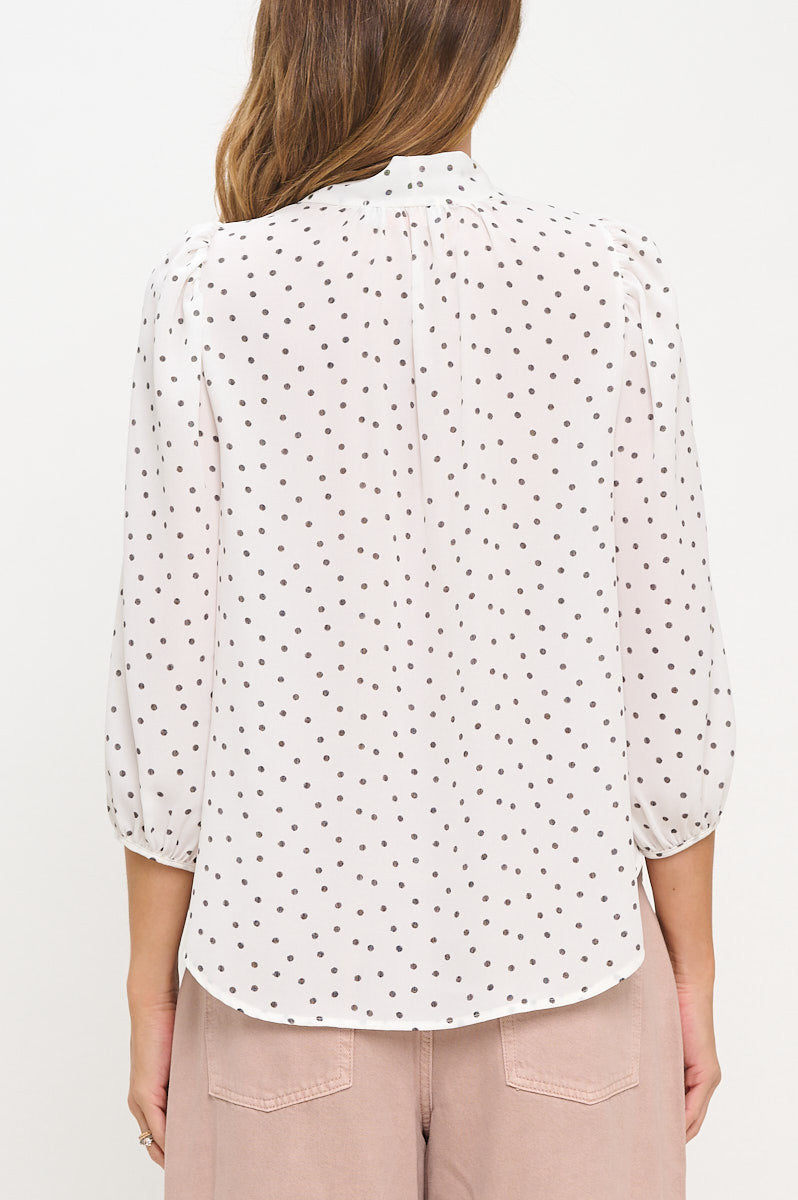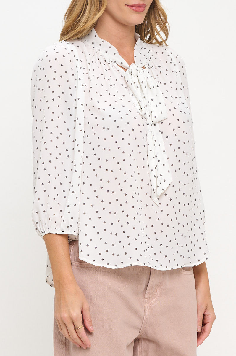 Made in USA Polka Dot Semi Sheer Top with Neck Tie. Fabric content: 100% Polyester.