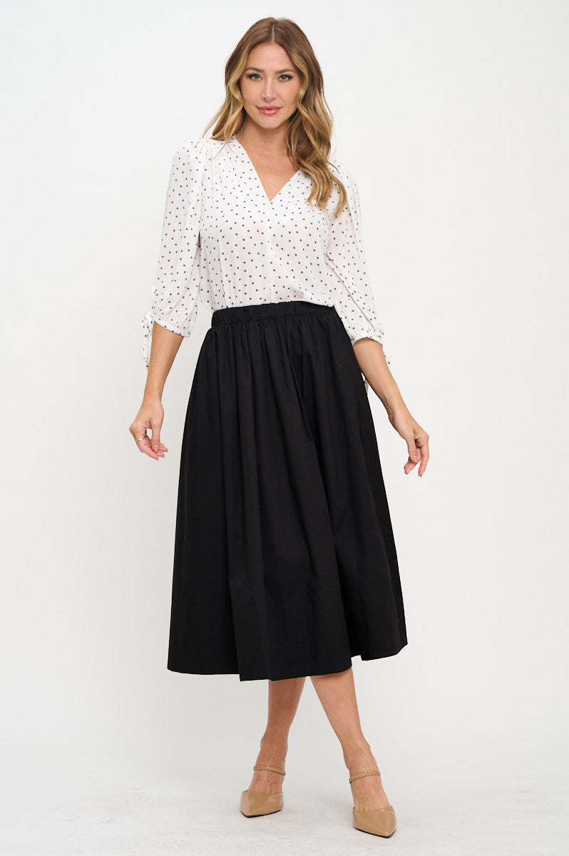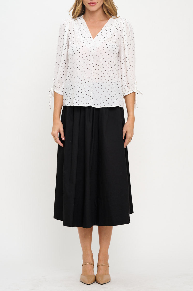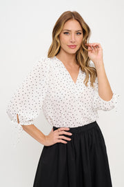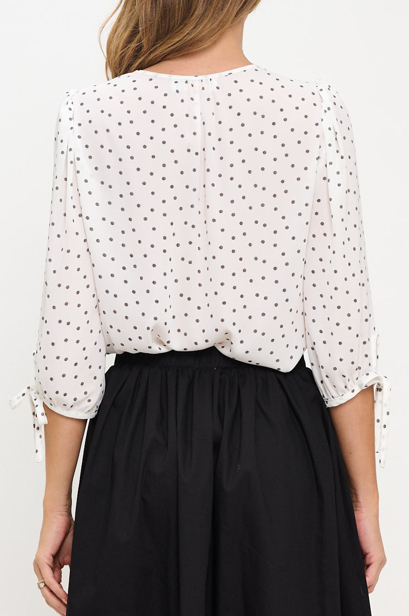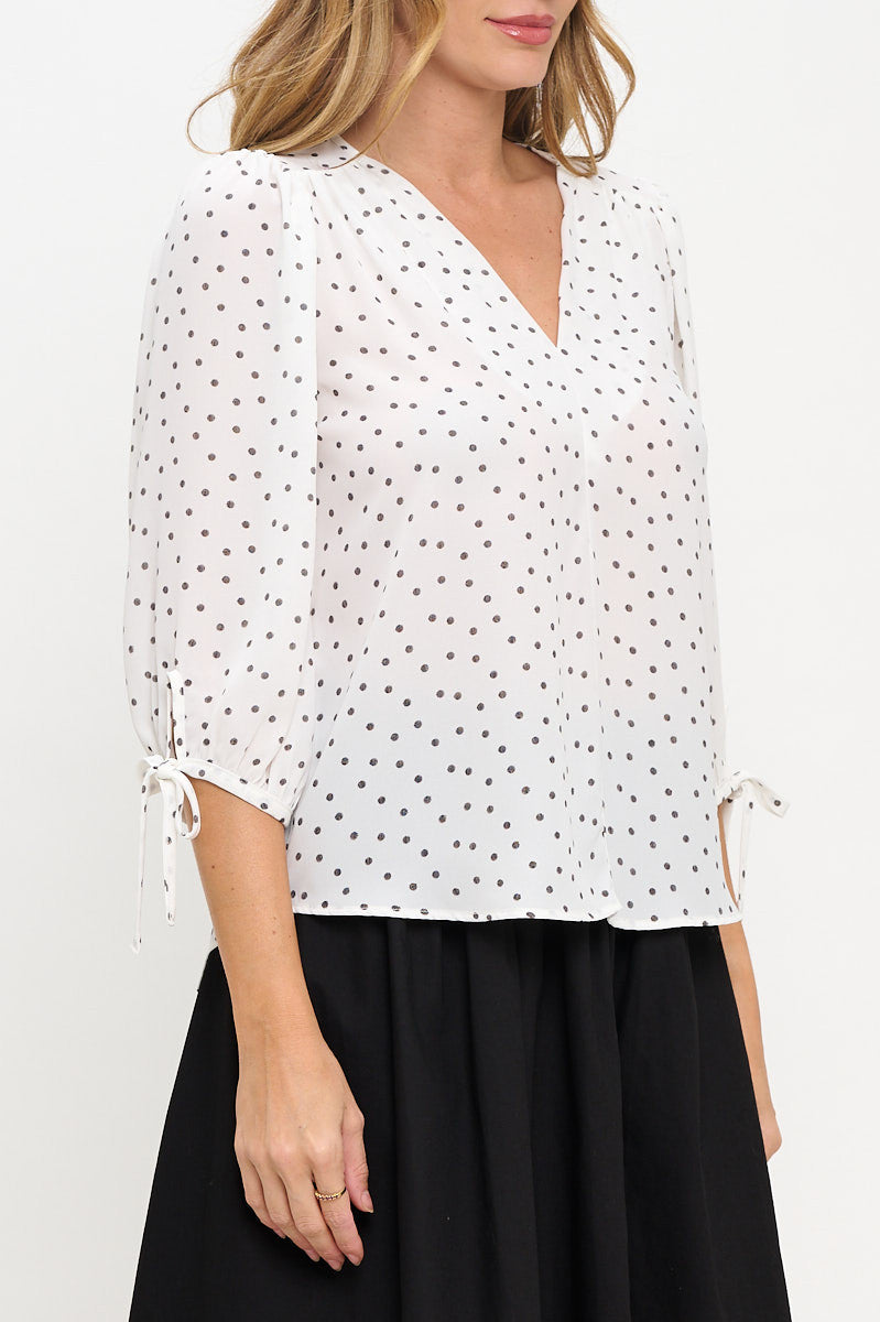 Polka Dot Semi Sheer V neck Top with Sleeve Tie