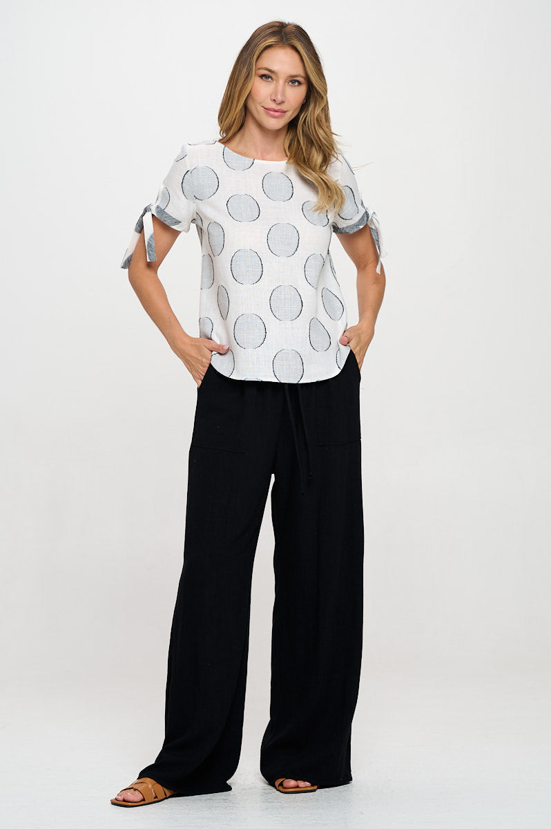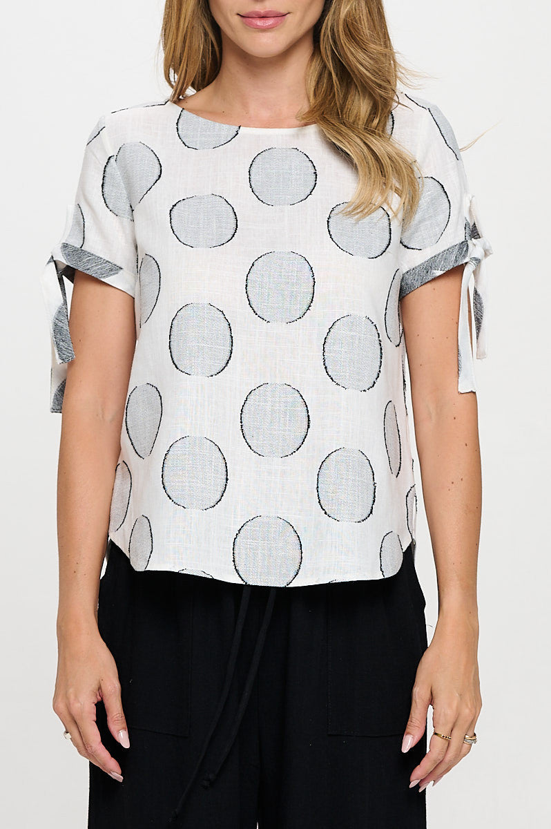 Made in USA Polka Dot Short Sleeve Top with Tie Sleeve. Fabric content: 60% Rayon, 30% Linen, 10% Cotton.
