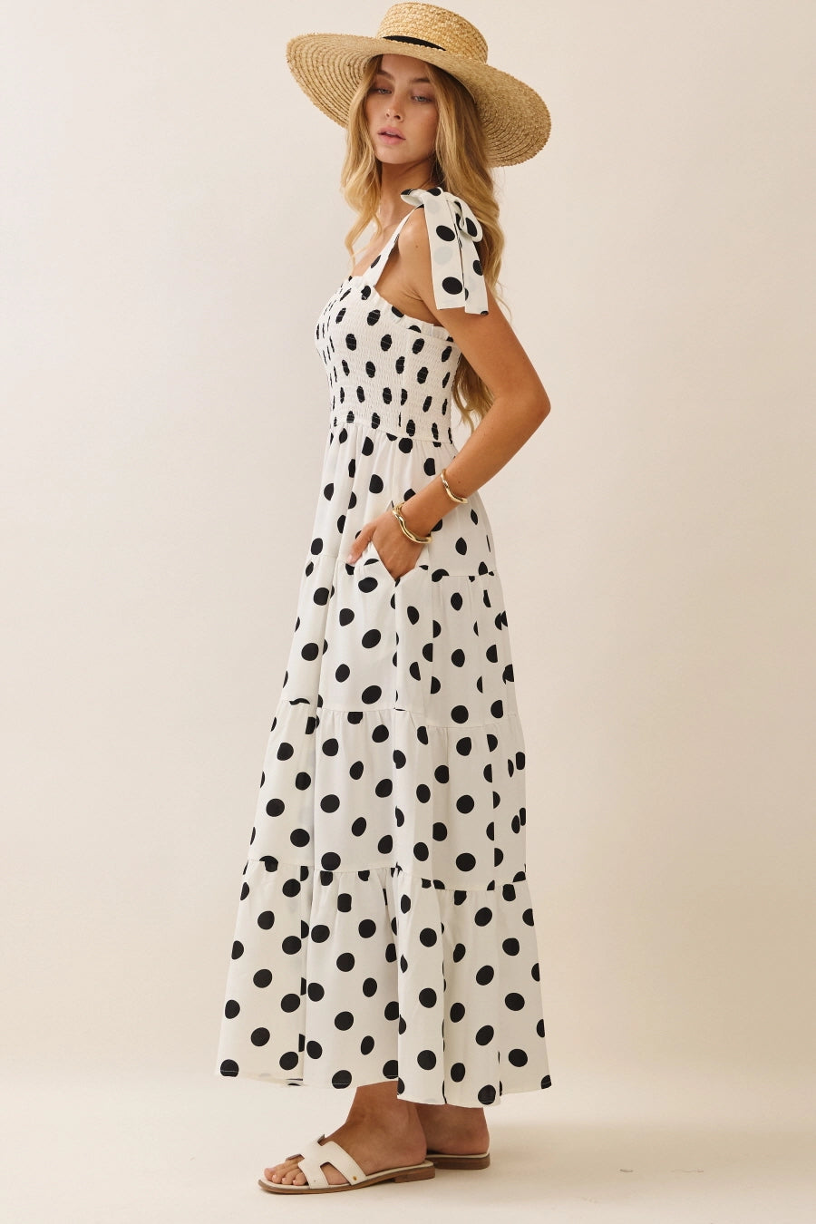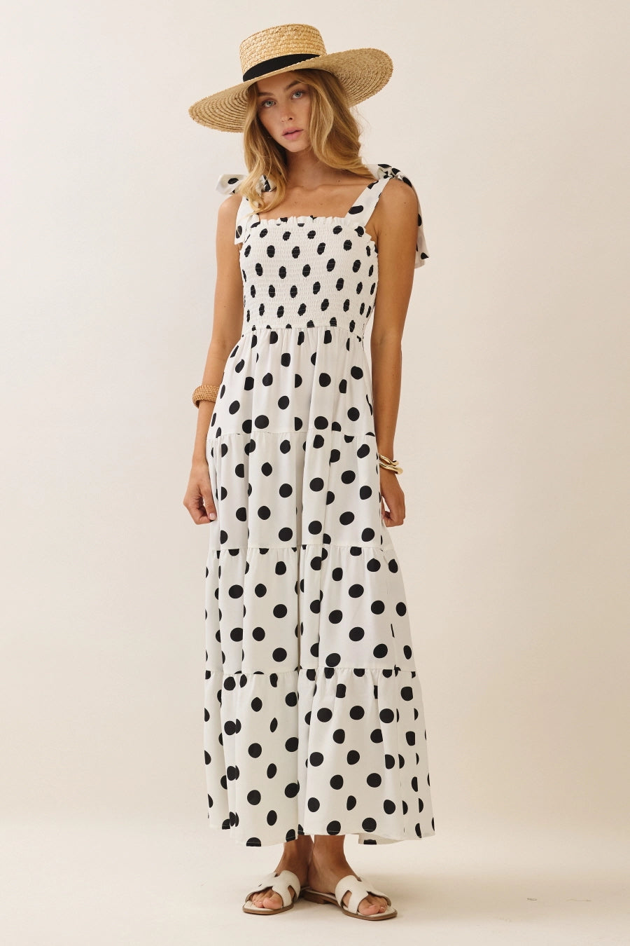 Polka Dot Sleeveless Tired Midi Dress with Smocked Top