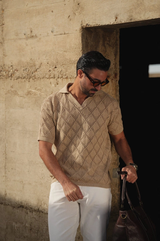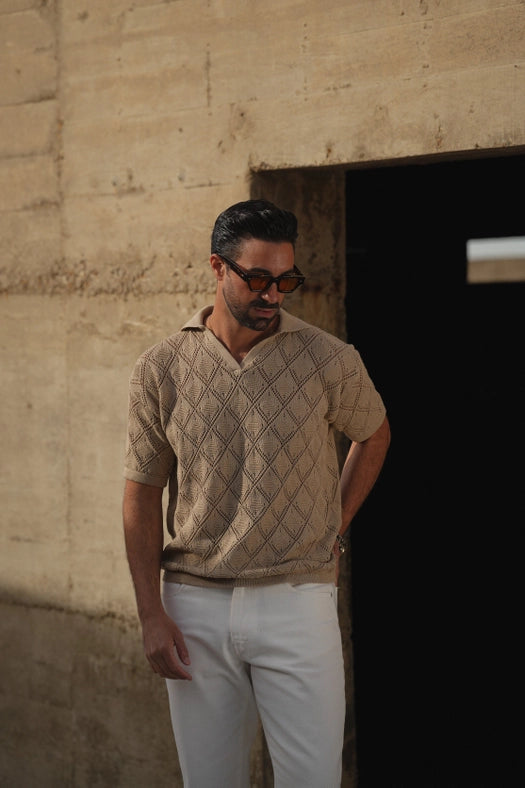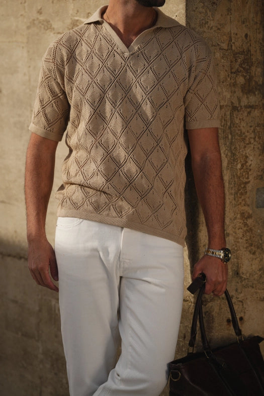 Polo Geometric Design Open-Collar Taupe Shirt
