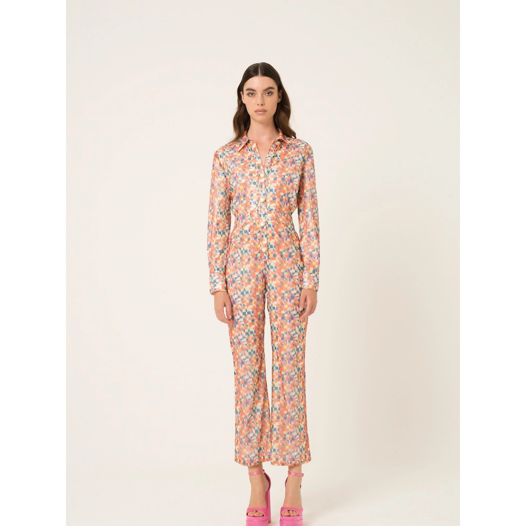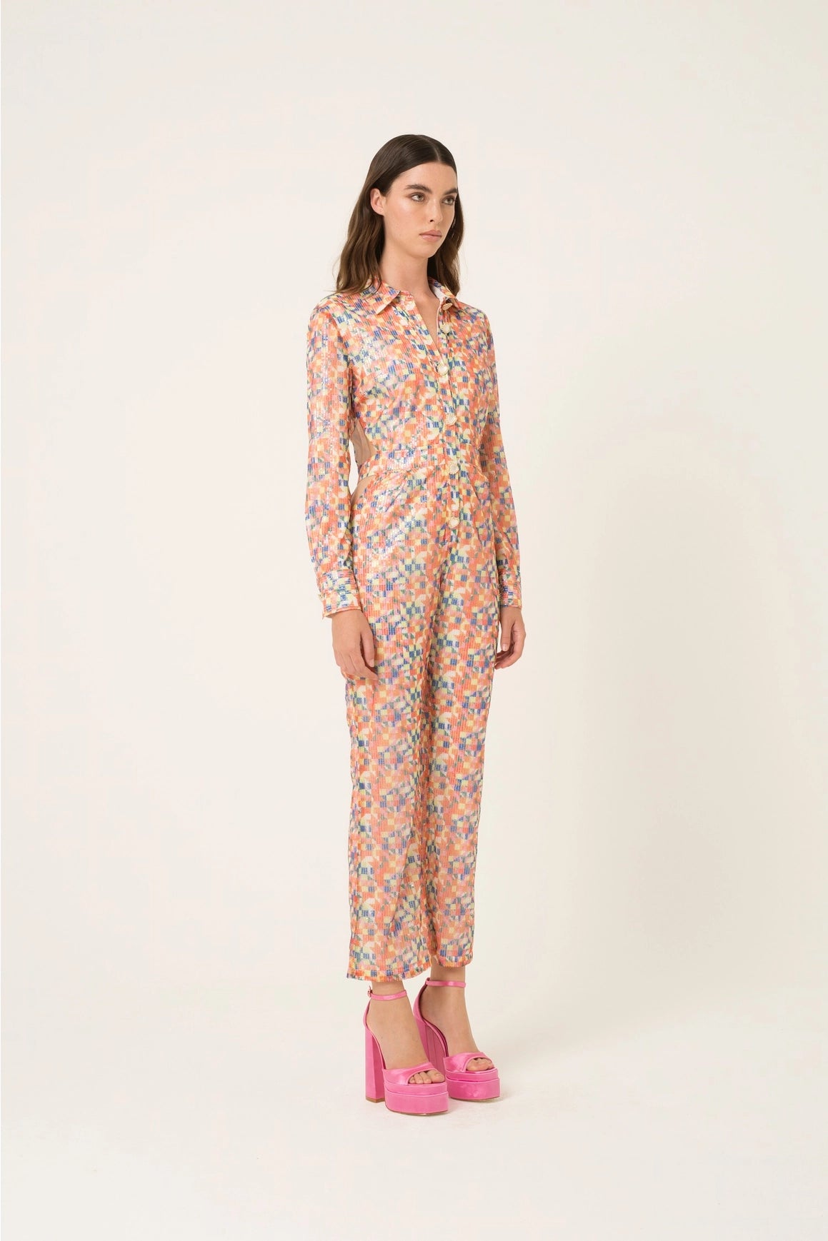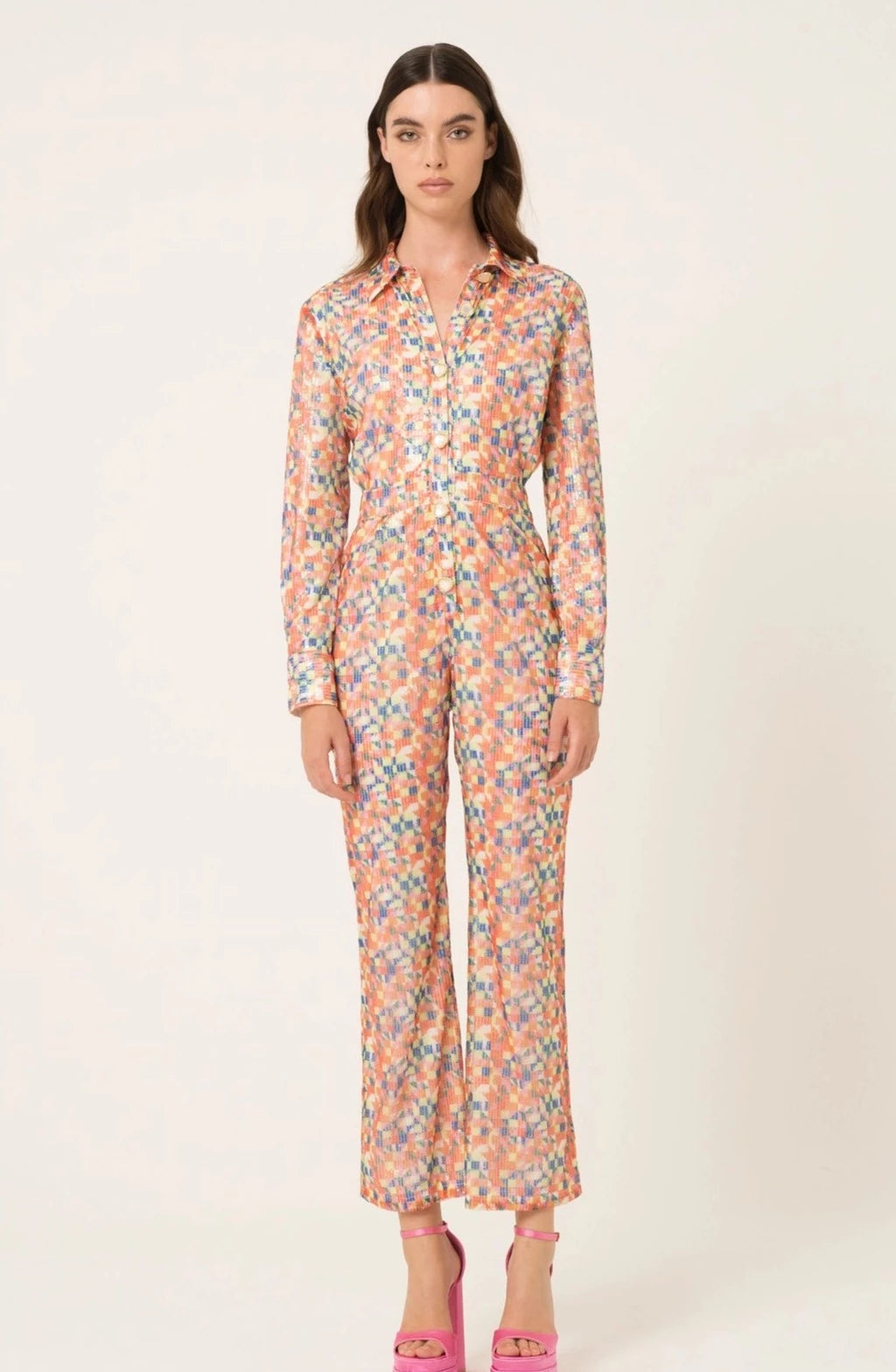 This Poppy Long Sleeve Multi Color Jumpsuit is sure to make a statement with its intricate multi-color checked sequin fabric. Crafted with a button-through fastening and collar, you'll be able to balance style and practicality for any occasion. Dress it up with heels or down with trainers to make the look your own.