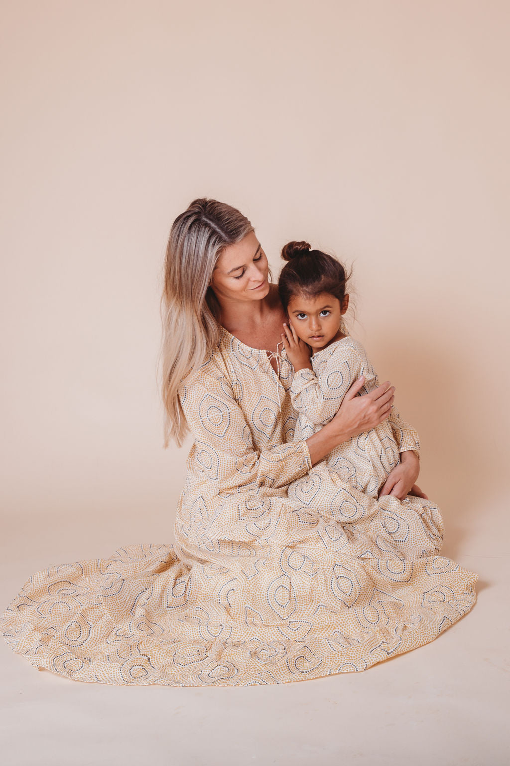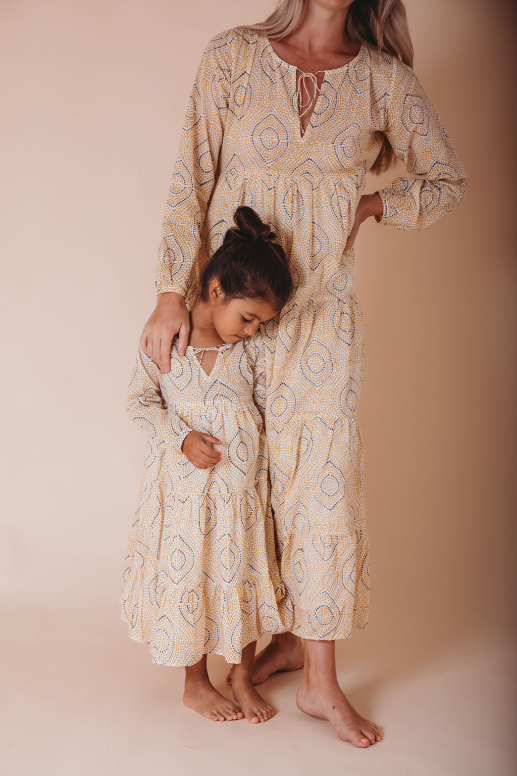 Each dress is handmade and hand block-printed on the finest India cotton voile. Each dress is also double lined to keep things private under there! Easy to machine wash and we promise it will become a staple "go to dress!" Boho fit.