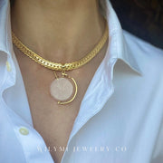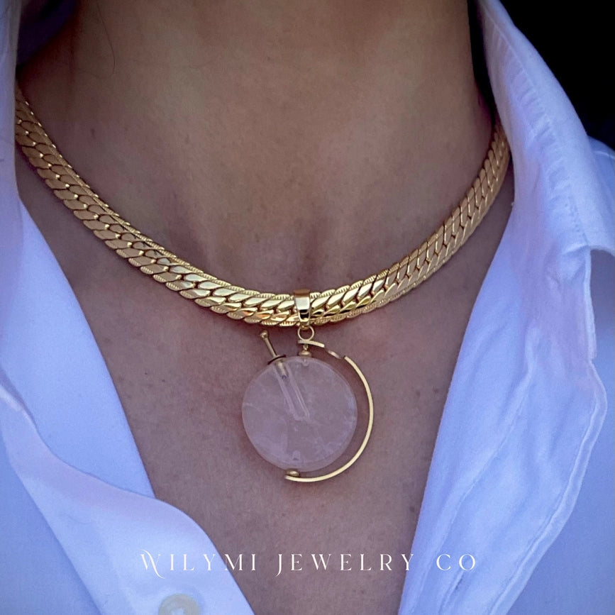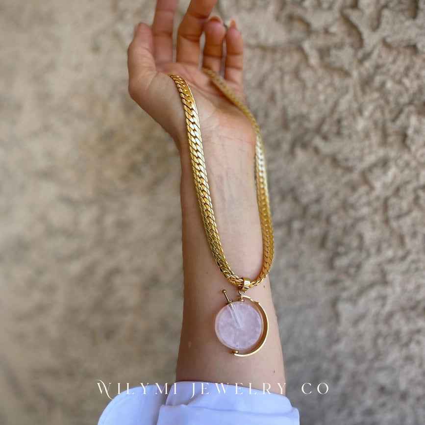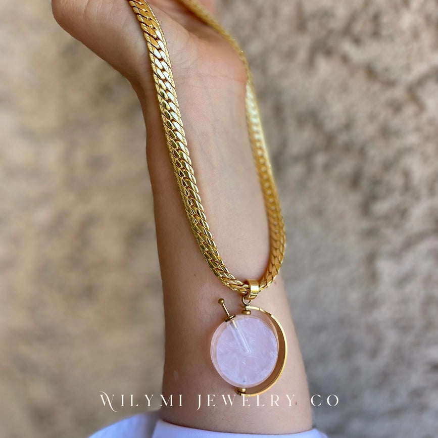 Elevate your presence with our PRESENCE Rose Quartz Aromatherapy Necklace. Made with 24k Gold Filled and 12 volt electroplating for extra durability. Customize length or add an extender. Infuse your favorite essential oil in the votive and ground yourself on the go. Pendant height: 1.5 in.