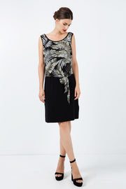 Sleeveless summer dress with a round neckline. The inner dress is in black stretch jersey fabric. The double outer layer is in woven print chiffon type fabric, 100% viscose. The outer piece ties in the front and attaches at the shoulders and sides. Darts at the bust for the perfect fit. A line silhouette. Our model has height 178 cm and wearing size 36. Measurements for size 38 (in cm):Bust-46, Body length-98, Waist-44, Shoulder width-34, Hemline -52. Garment is loose fit.