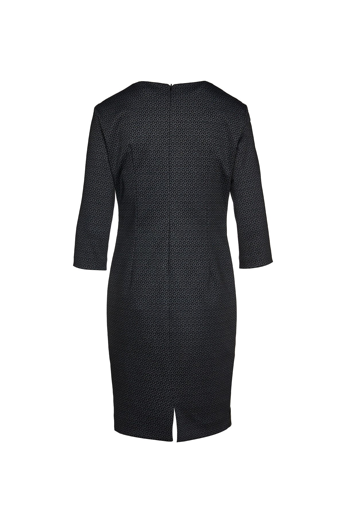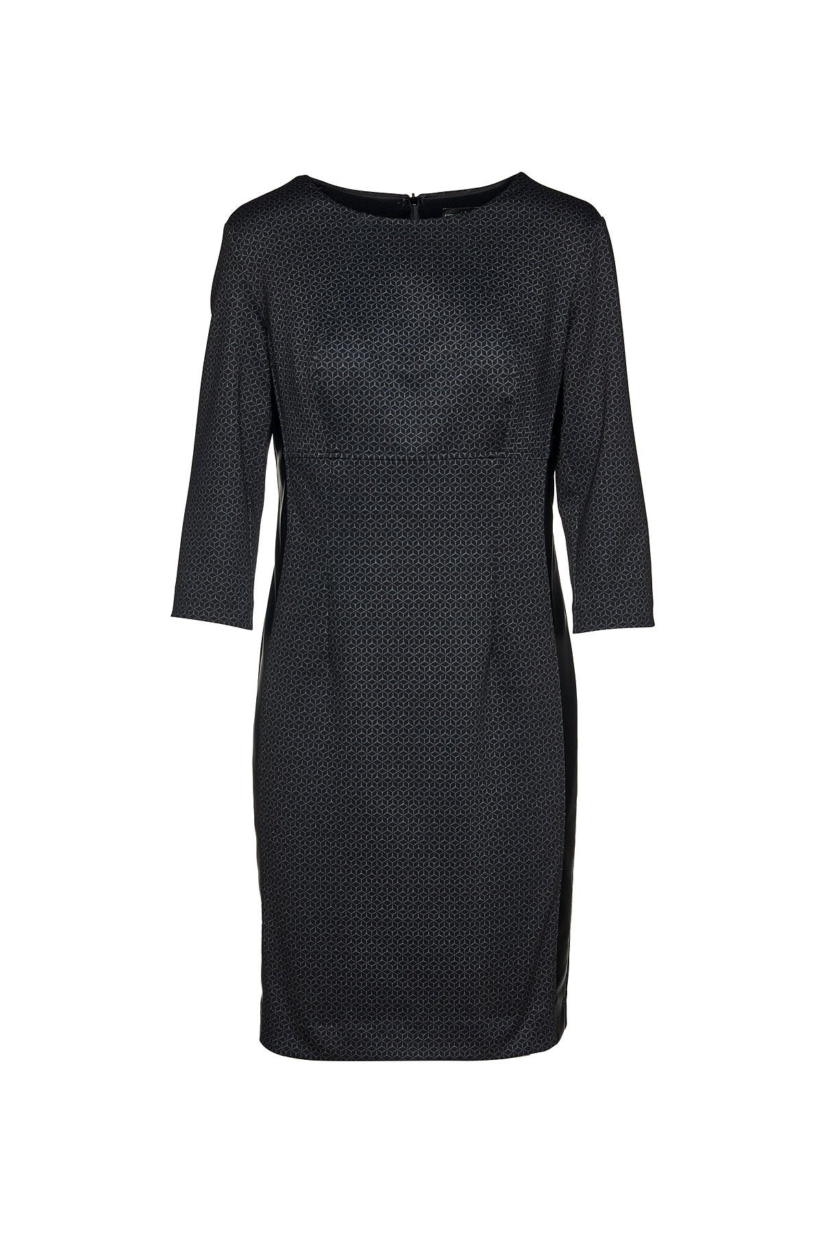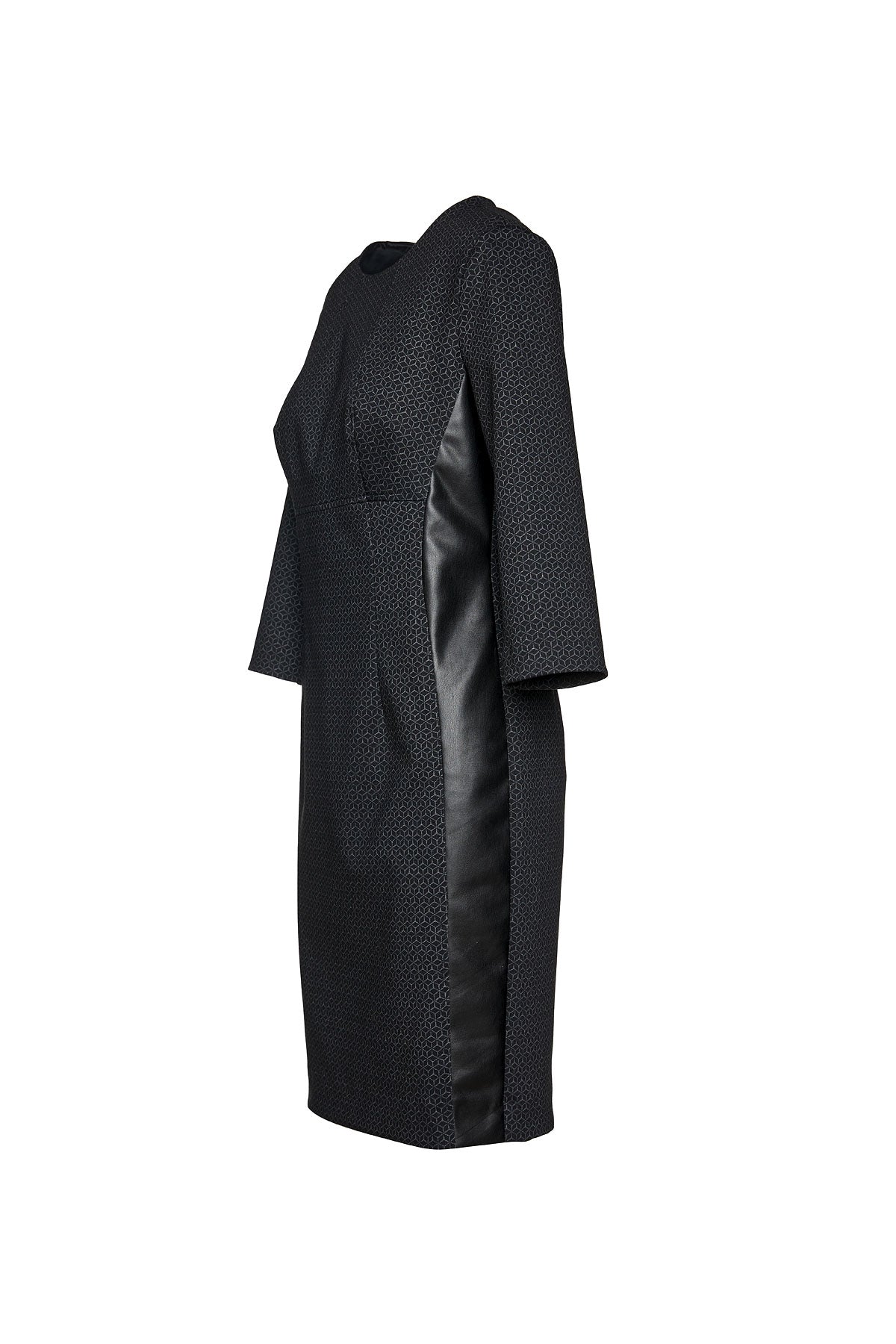 Pencil dress in print Punto di Roma fabric. Round neckline and ¾ sleeves. Concealed zip fastening in the back. Decorative seams - darts in the front which start at the neckline and end at the waist. Seam underneath the bust creating a subtle empire line. 6cm wide faux leather panel at the side from the underarm to the hem. Small 10cm slit at the back. Fully lined. Fitted silhouette.