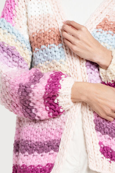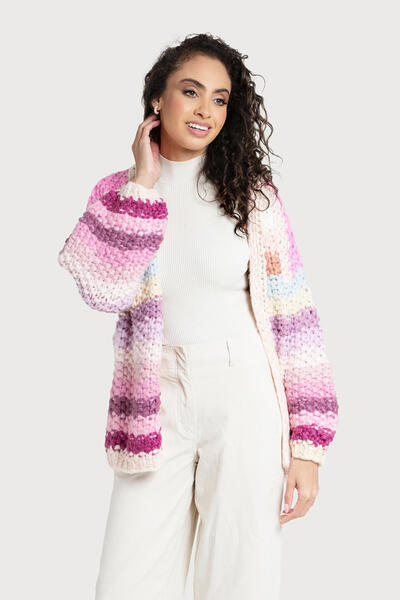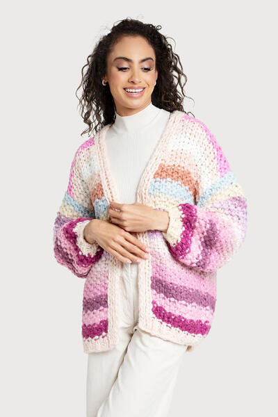 Step into fall with our stylish and cozy Rainbow Knitted Cardigan. The lightweight and soft material will keep you warm while the oversized fit adds a touch of comfort. The chunky knit sleeves and vibrant rainbow stripes make for a bold and trendy look. Perfectly paired with black pants or leggings and a light-colored top. Made in India from 100% acrylic.