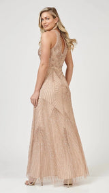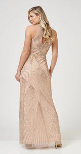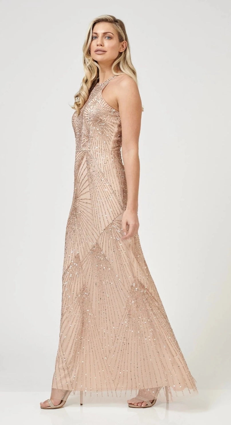 Lace & Beads halter neck mesh maxi with and embellished sequins in champagne.