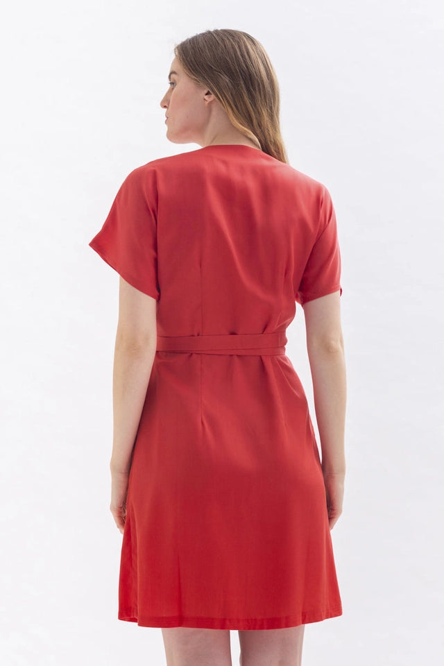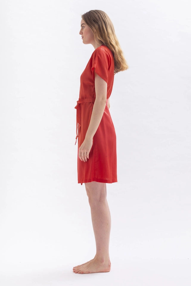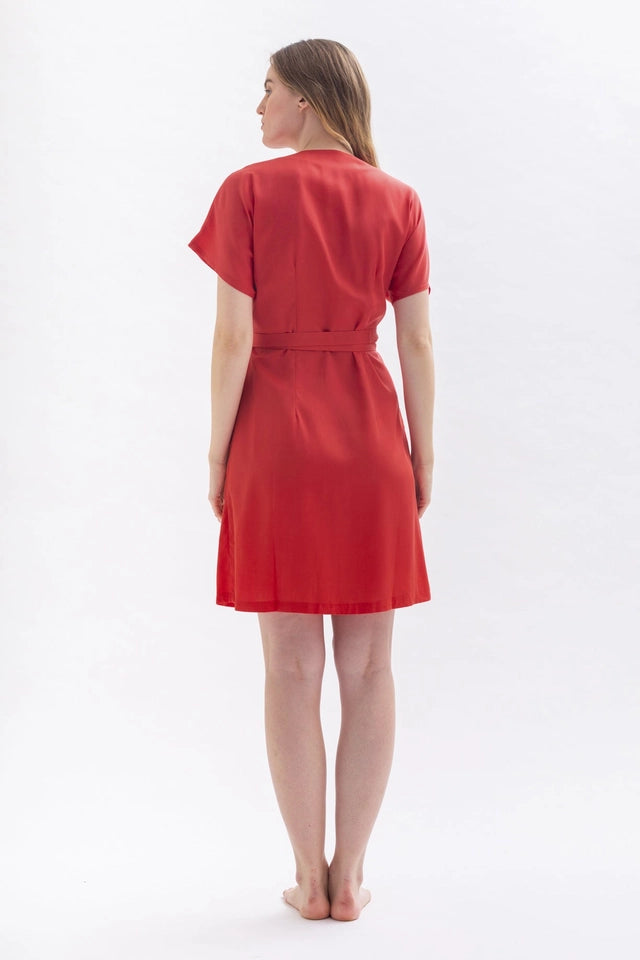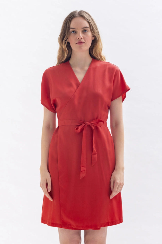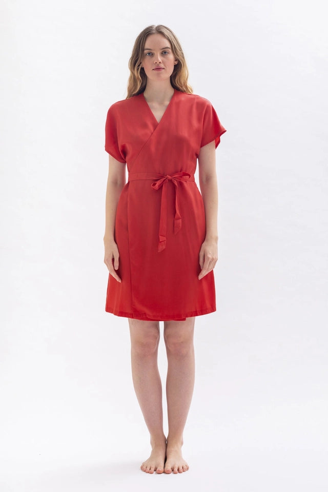 Introducing our Red Tencel Wrap Dress “Caar-Men,” made of sustainable fabric and fairly produced in Poland. This knee-length dress boasts a loose cut and side pockets, perfect for any occasion. Its supple tencel fabric has a silk-like shine, making it a versatile and elegant addition to any wardrobe.