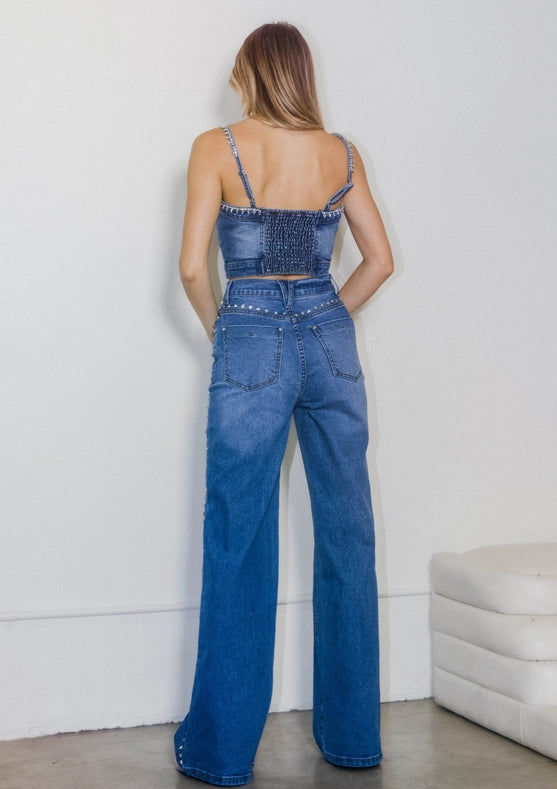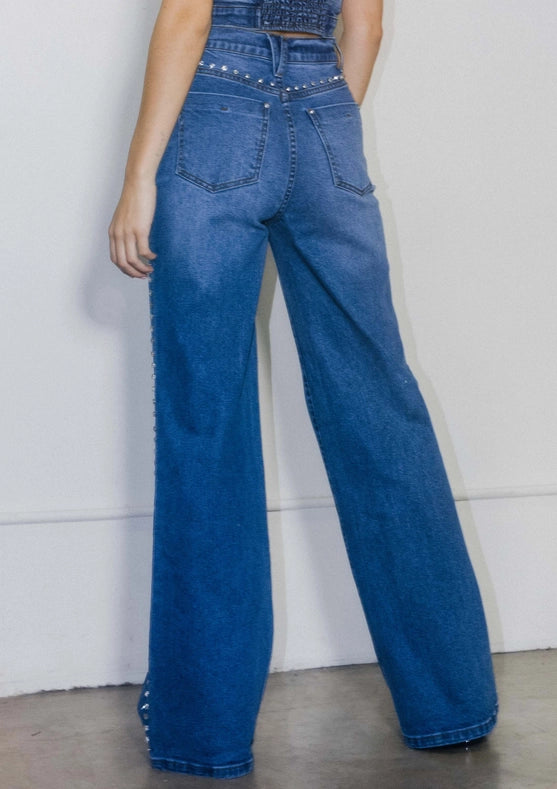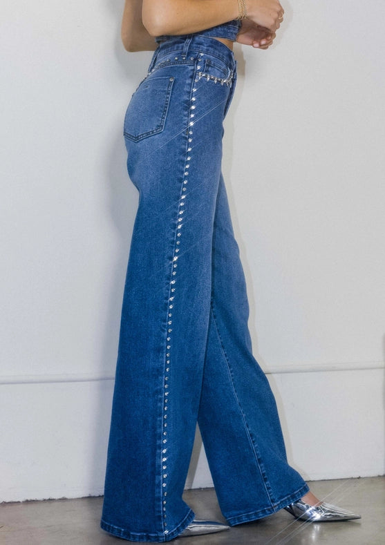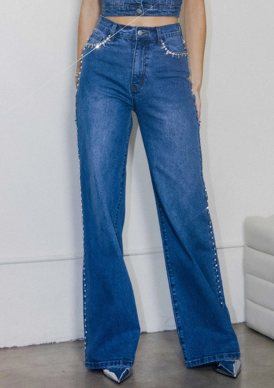 Add some sparkle and shine to your wardrobe with our Rhinestone High-Rise Wide Leg Jeans. These trendy jeans feature rhinestone detailing, a classic 5-pocket design, and a comfortable zip-fly closure. Made of 99% cotton and 1% spandex fabric, these jeans offer both style and comfort.