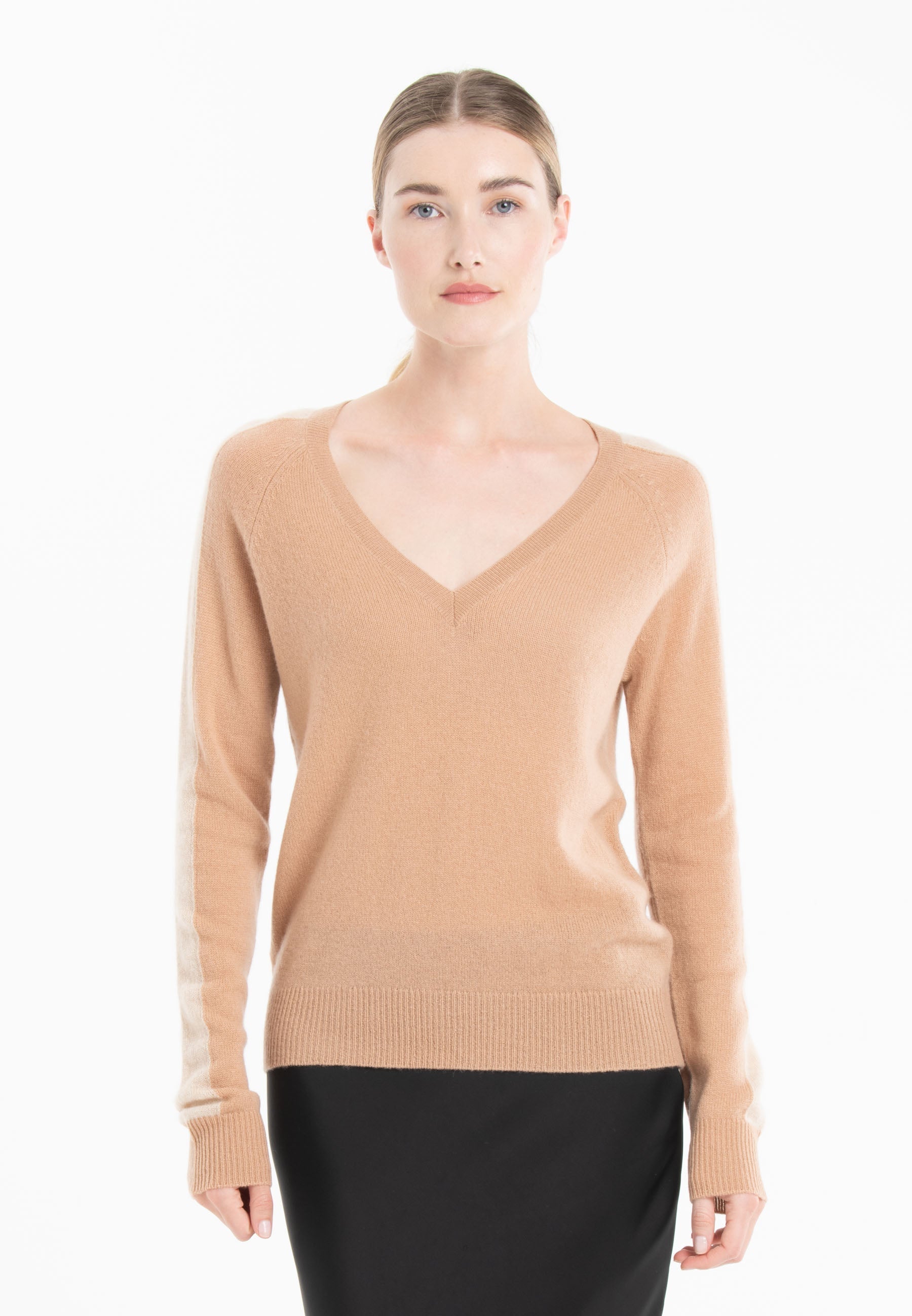 RIA 1 Pull col V avec bande sur les manches en cachemire camel clair/beige