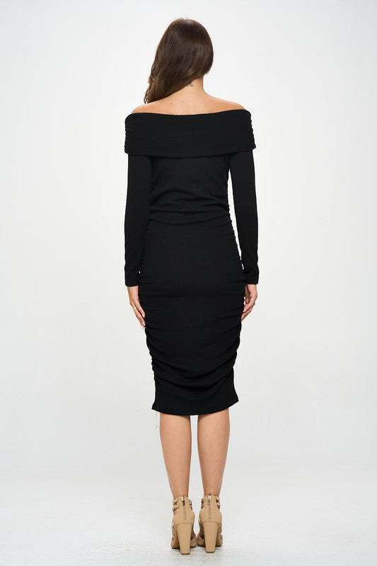 Ribbed Knit Off Shoulder Long Sleeve Bodycon Dress With Ruched Detail