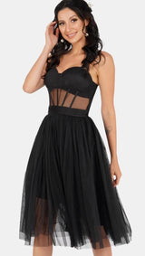 Lace & Beads Rita black corset midi dress featuring a sheer waist and elasticated back for a flattering fit. This gorgeous black mesh dress has a fitted bodice and an accentuated waist with a layered skirt. An a-line midi dress with a tutu skirt and sweetheart neckline is perfect as a black cocktail dress, prom dress or party dress.