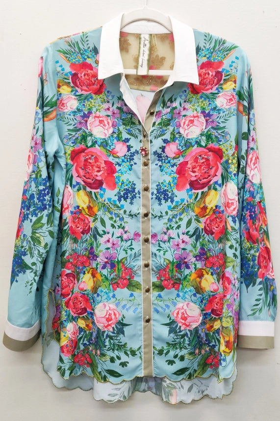 The Roma Shirt is a perfect combination of elegance and style. Its floral print, sequin embroidered mesh back yoke, and metallic gold thread scallop high-low hem make it a must-have for any fashion-forward individual. With antique gold metallic buttons and a decorative crystal button, it exudes sophistication. Made with 100% viscose and 100% polyester trim, this shirt is a high-quality addition to your wardrobe.