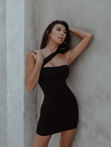 Show off your curves with our Happy Hour cocktail dress! This little black dress is made from a cotton-spandex blend for a flattering fit, and it features an unexpected asymmetrical strap to further accentuate your shape. And thanks to the perfect mini-length hem, this dress pairs well with everything from tall boots to chunky black shoes.