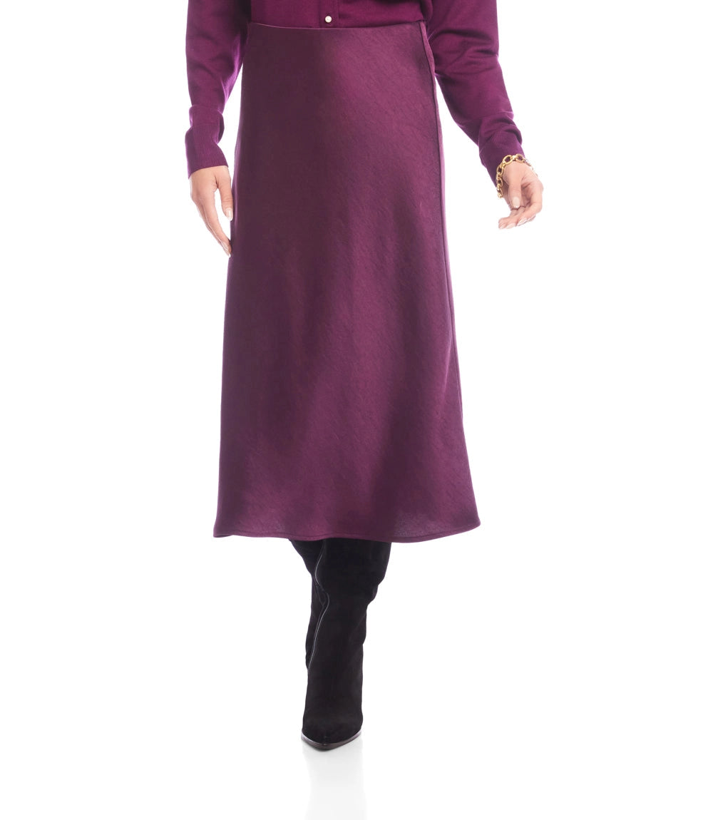 Crafted from luxurious recycled satin, this midi skirt features a bias cut that creates an elegant, flowing silhouette with subtle movement at the hem. The mid-length design transitions seamlessly from day to evening, while the elasticized waistband ensures comfort without compromise. Fully lined for a refined finish, this versatile piece embodies timeless sophistication. The gentle drape skims the body gracefully, making it an essential addition to any discerning wardrobe. **Fabric:** 55% Polyester, 45% Recycled Polyester | **Lining:** 100% Polyester | **Length:** 32¼" (Size M) | **Care:** Hand wash cold, lay flat to dry or dry clean | **Imported**