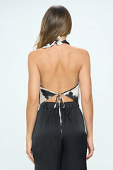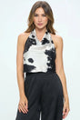 Made in USA Satin Cow Print Cowl Neck Backless Top. Fabric content: 97% Polyester, 3% Spandex. Available in other Colors.