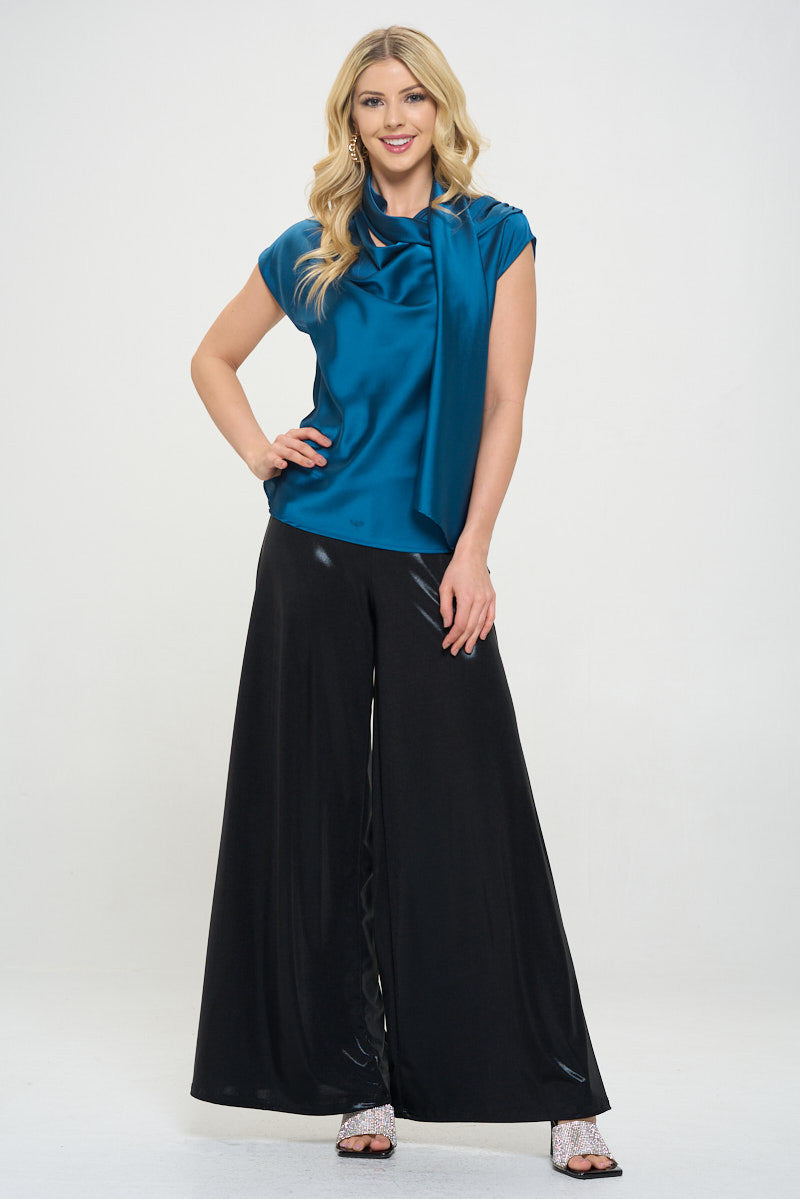 Satin Cowl Neck Short Sleeve Top with Scarf Detail
