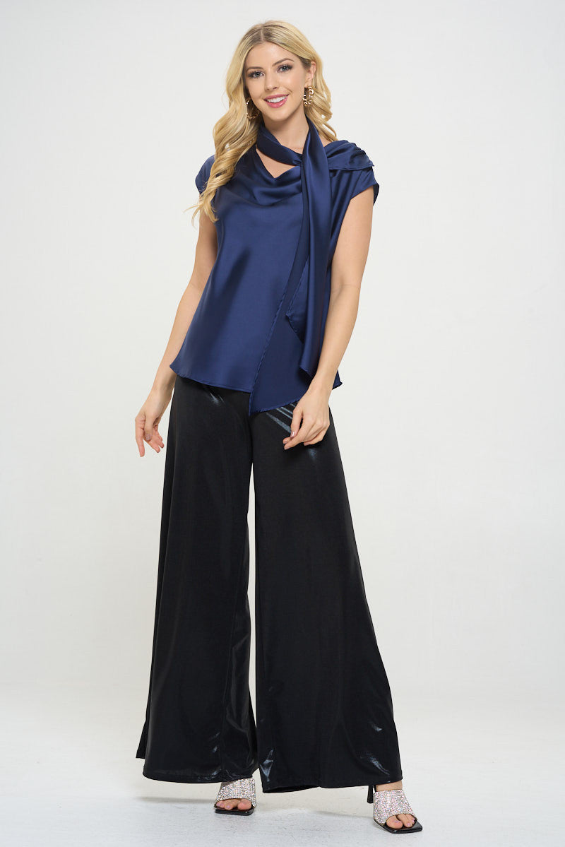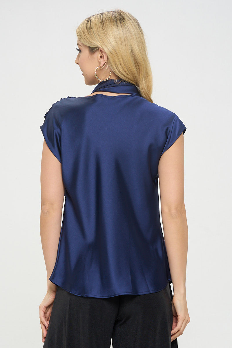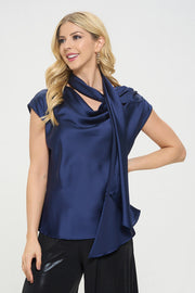 Satin Cowl Neck Short Sleeve Top with Scarf Detail