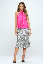Made in USA Satin Criss Cross Halter Top with Open Back. Fabric content: 97% Polyester, 3% Spandex. Available in other Colors.