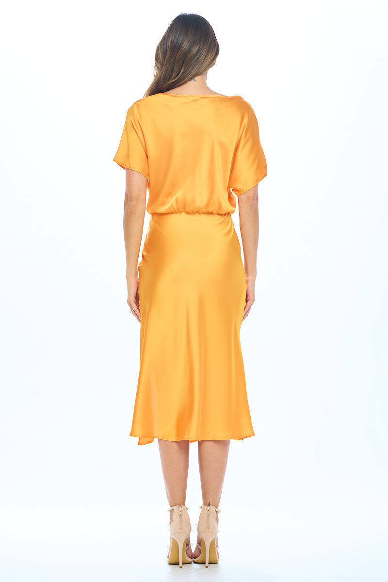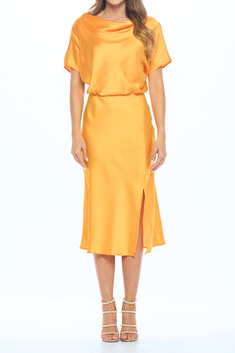 Made in USA Satin Stretch Print Dress with Slit. Available in other Colors. Fabric content: 97% Polyester, 3% Spandex.