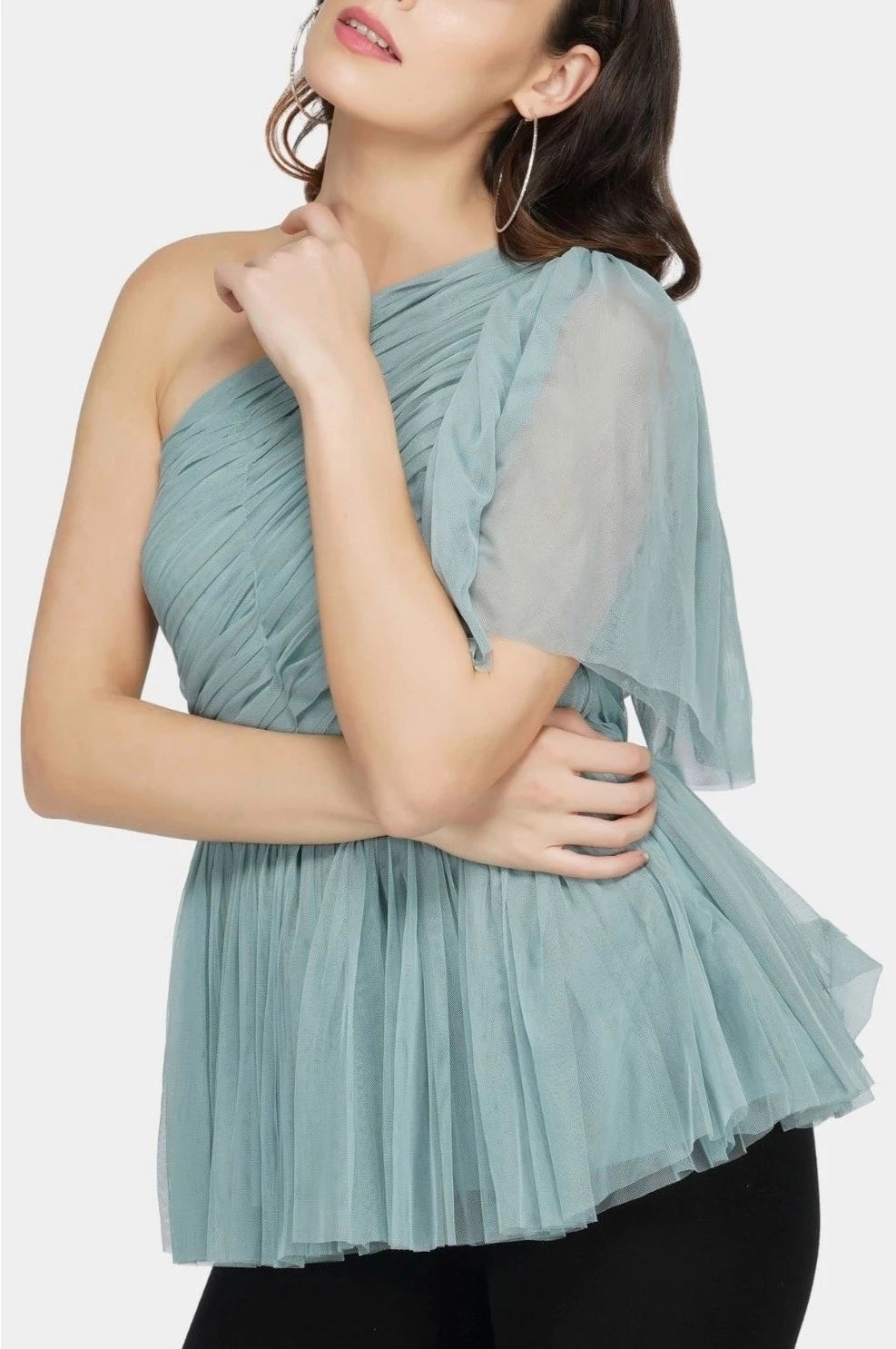 Lace & Beads Scarlett teal tulle one-shoulder top. Flattering pleated bodice and peplum mesh skirt with statement one shoulder sleeve. Make a dramatic entrance with this statement top.