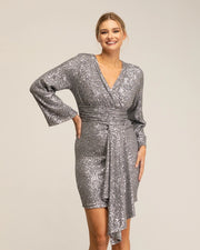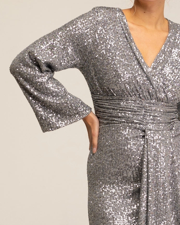 This elegant sequin dress features a flattering draped waist and a stylish V-neck design. Made from a luxurious blend of 70% polyester and 30% viscose, it offers both comfort and style. Perfect for special occasions and events, this dress will make you stand out in the crowd.