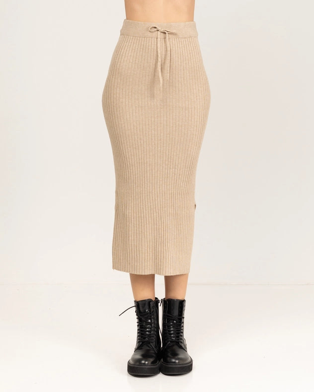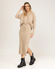 This SET_BEIGE is perfect for both style and comfort. The ribbed knit material adds texture to the set, while the oversized jersey and fitted midi skirt flatter the body. Made with quality materials, this set is a must-have for any wardrobe.