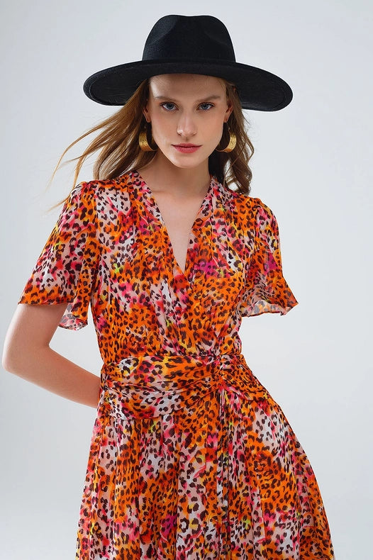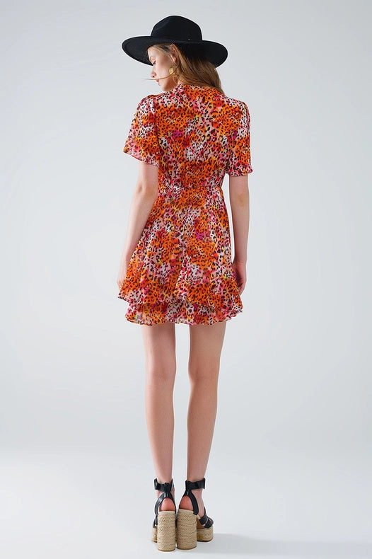 Short Orange Multicolored Dress with Crossed Top with Animal Print