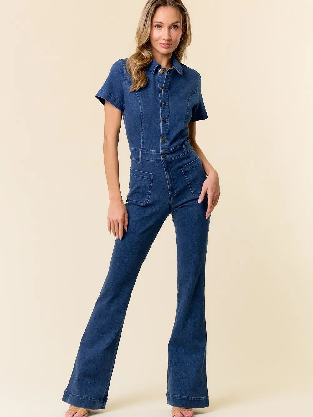 Short Sleeve Boot Leg Cut Denim Jumpsuit