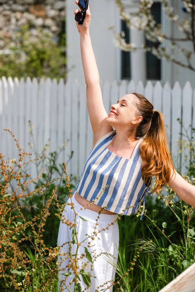 This sleeveless boxy crop top combines timeless vertical blue stripes with a contemporary silhouette. Crafted from a premium 30% linen and 70% cotton blend, it offers exceptional breathability and structure. The square neckline and wide straps create a flattering frame, while adjustable side ties allow for customized comfort. This versatile piece transitions effortlessly from casual daytime wear to evening outings when paired with high-waisted bottoms.