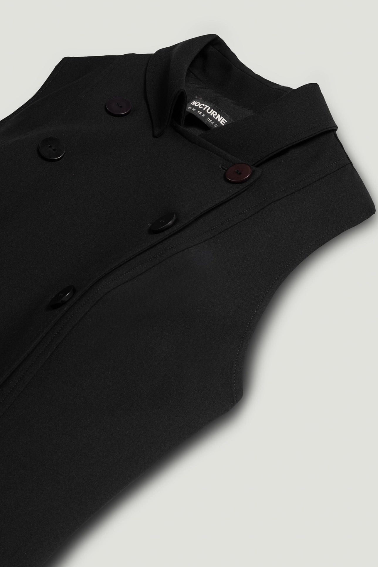 This sleeveless midi dress embodies timeless modern tailoring with a stand collar and double-breasted button detailing for a sleek, polished appearance. The fitted bodice, enhanced by contour seams, accentuates the waist before flowing into a classic A-line skirt with a crisp hem. Made from smooth woven fabric, it delivers an elegant silhouette that seamlessly transitions from daytime sophistication to evening refinement. Designed for a regular fit, this dress is true to size for a flattering and structured look. Dry clean only for lasting quality and shape.
