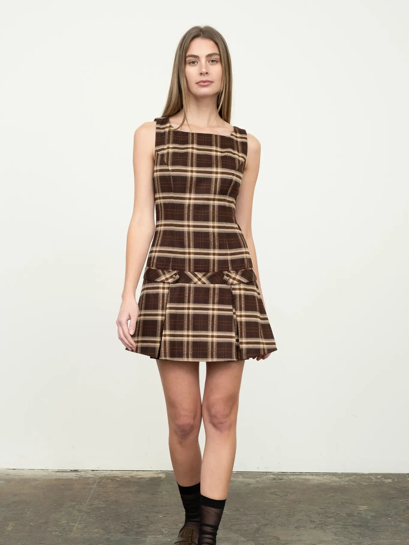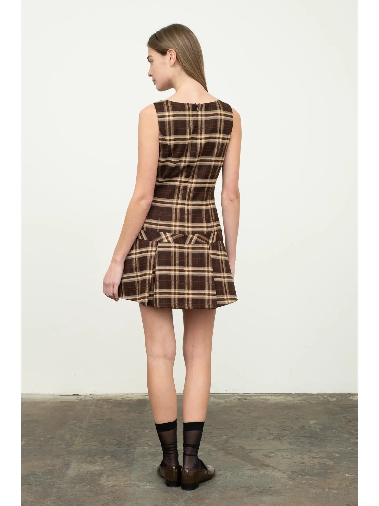 This refined mini dress features a timeless plaid pattern with a sophisticated silhouette defined by its drop waist and pleated accents. The sleeveless cut pairs beautifully with a discreet back zipper and subtle tab detailing for understated elegance. Crafted from a premium blend of polyester, viscose, and elastane, the fully lined design ensures comfort and durability. Perfect for elevated casual occasions or dressed-up evenings.