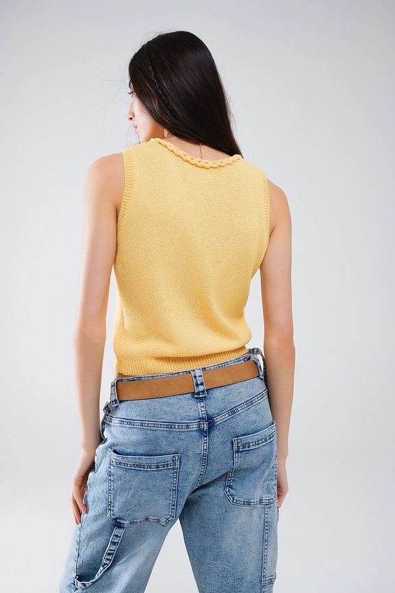 Sleeveless Yellow Sweater with Crew Neckline and Braid Detail At Neckline