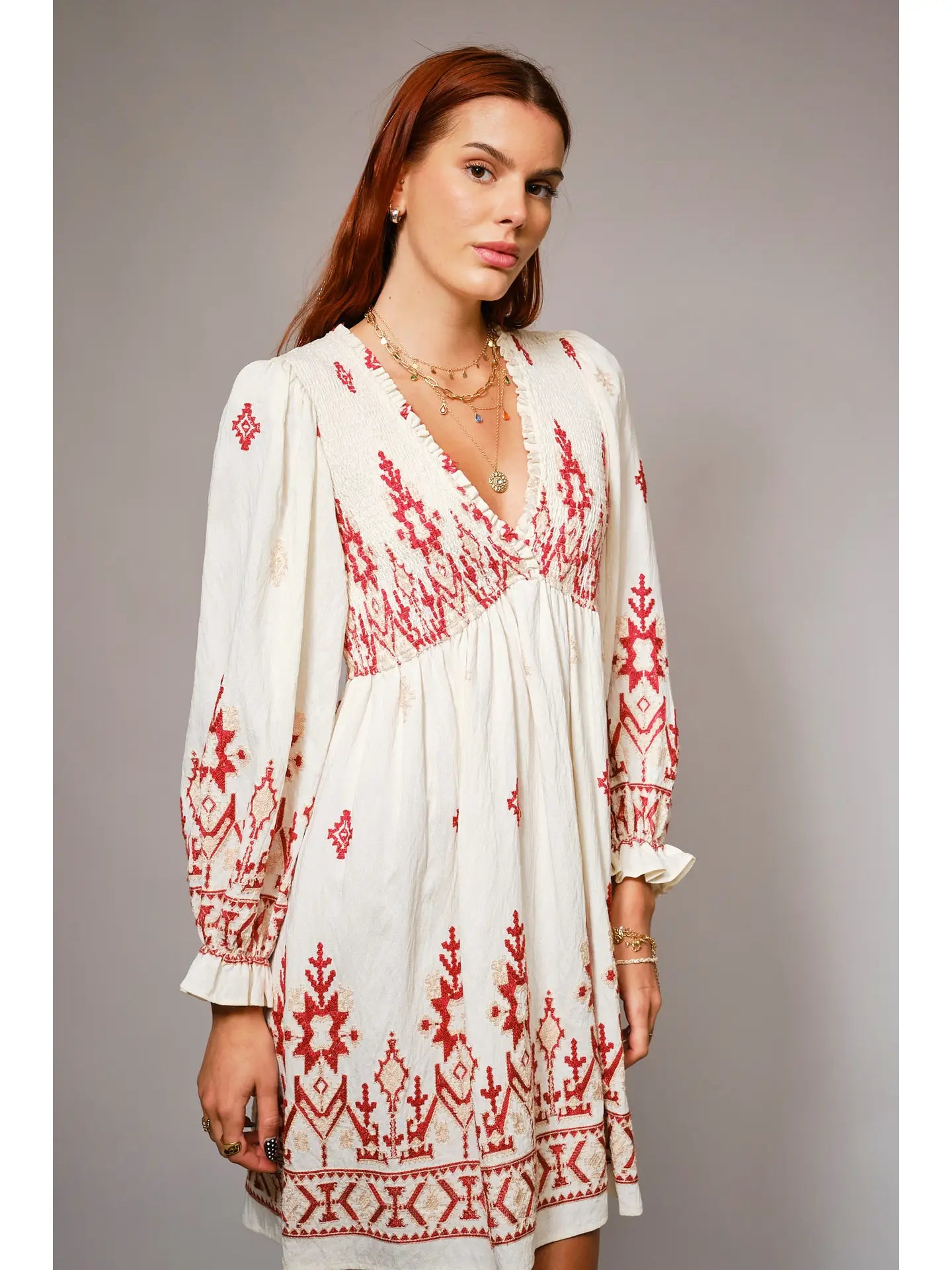 Embrace effortless elegance with this refined boho mini dress, featuring a flattering smocked V-neckline and dramatically voluminous sleeves. Delicate ruffle detailing frames the silhouette while intricate burgundy embroidery adds artisanal sophistication. Crafted from a luxurious rayon and nylon blend for fluid movement and comfort. Our model, standing 5'8", wears a size Small.