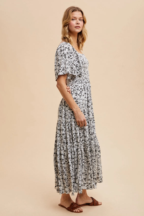 Smocked Floral Square Neck Maxi Dress OFF WHITE