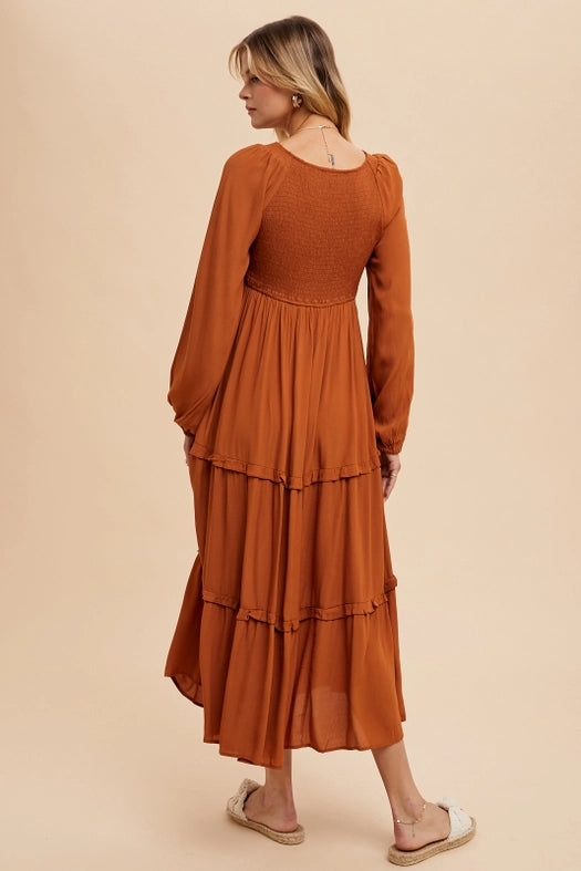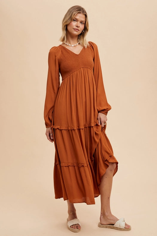 Smocked Ruffle Tiered Maxi Dress SEPIA