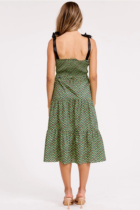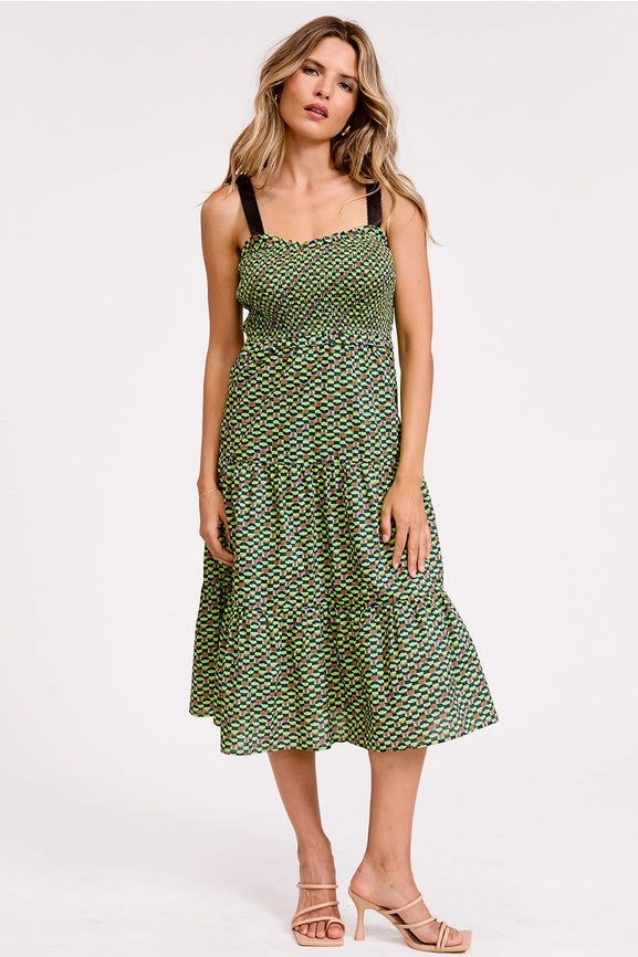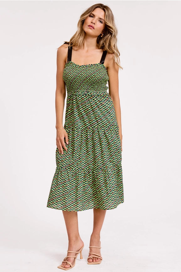 Stay stylish and comfortable in our Smocked Tiered Geo Midi Dress. Made of soft cotton, this dress features smocked detailing and wide black straps for a flattering fit. The tiered silhouette and vibrant geo print make it a perfect choice for any summer occasion.