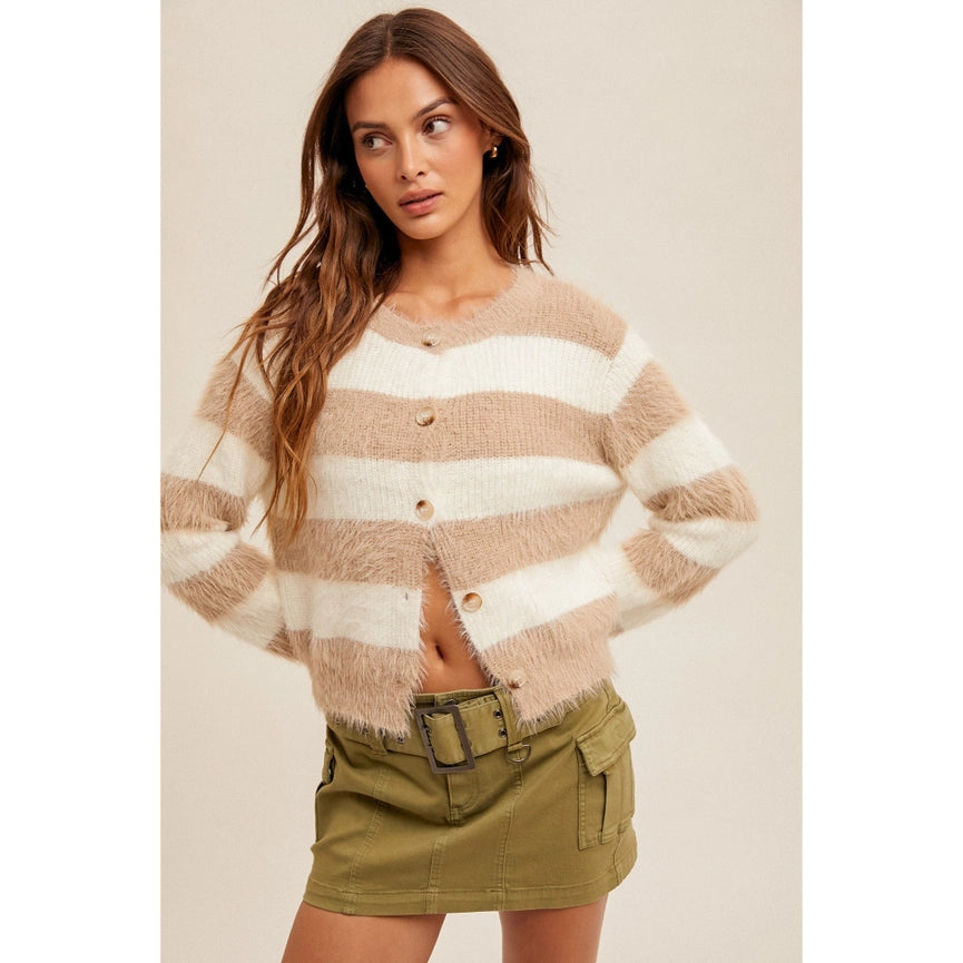Upgrade your wardrobe with the Soft Eyelash Yarn Stripe Crop Cardigan. This lightweight and cozy layering essential features a soft texture, trendy stripes, and a chic cropped design. Perfect for casual or dressy occasions, it effortlessly adds a fashionable touch to any outfit. Stay stylish and comfortable with this fashion-forward piece.