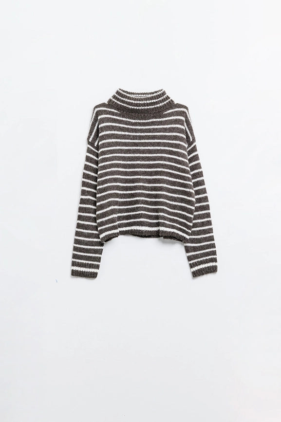 Stay warm and effortlessly stylish in our Soft Knit Striped Turtleneck Sweater in Brown. Crafted from fluffy knit fabric, it boasts a relaxed fit and trendy stripe design, with a snug high neck for added warmth. Perfect for daily wear, this sweater is the ultimate choice for staying cozy!