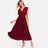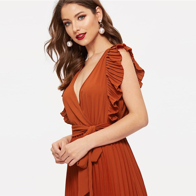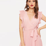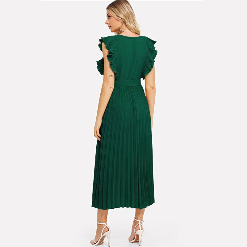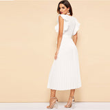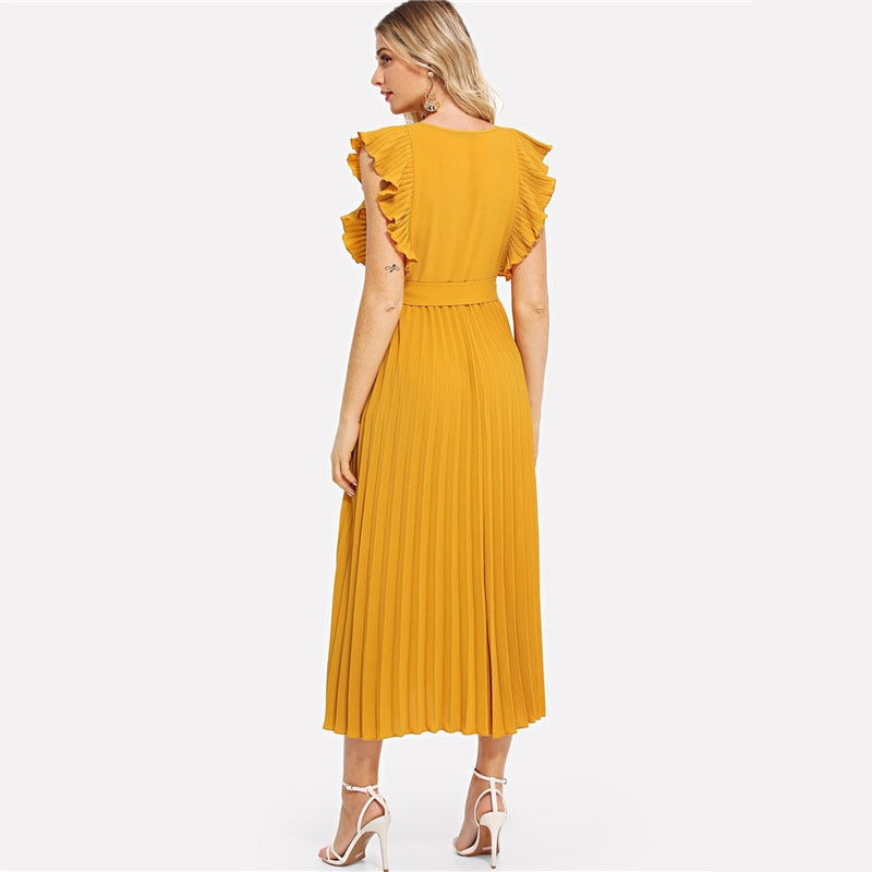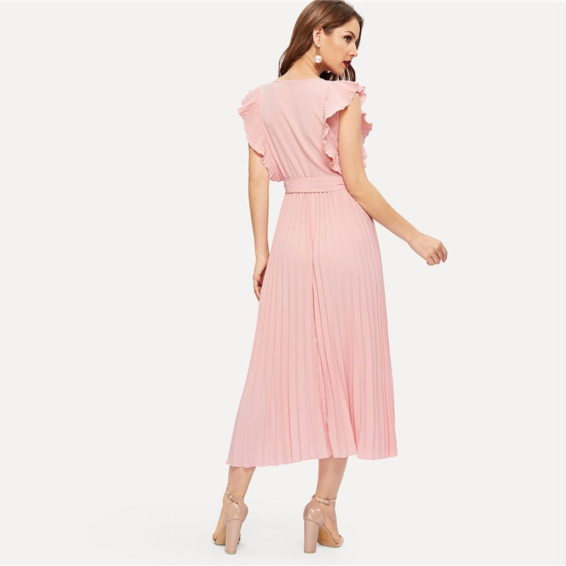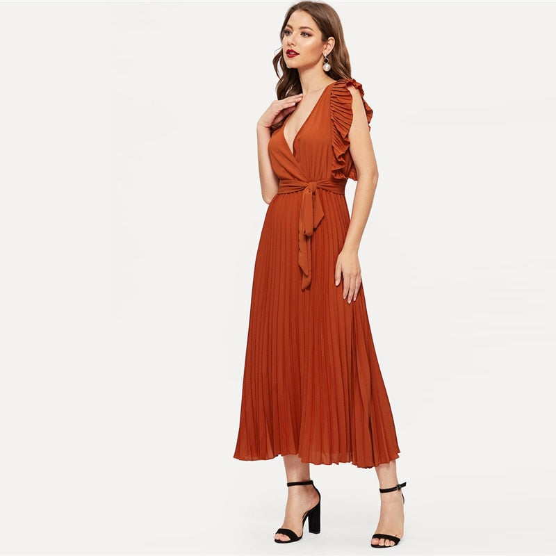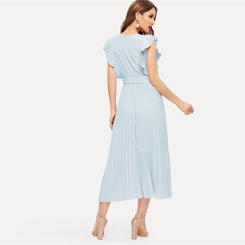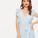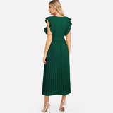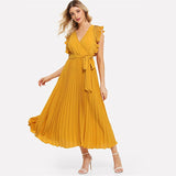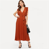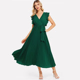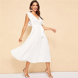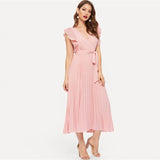 Soild Ruffle Trim Wrap Knot Summer Dress With Belt Women Clothes A Line High Waist Maxi Dress Ladies Pleated Dresses