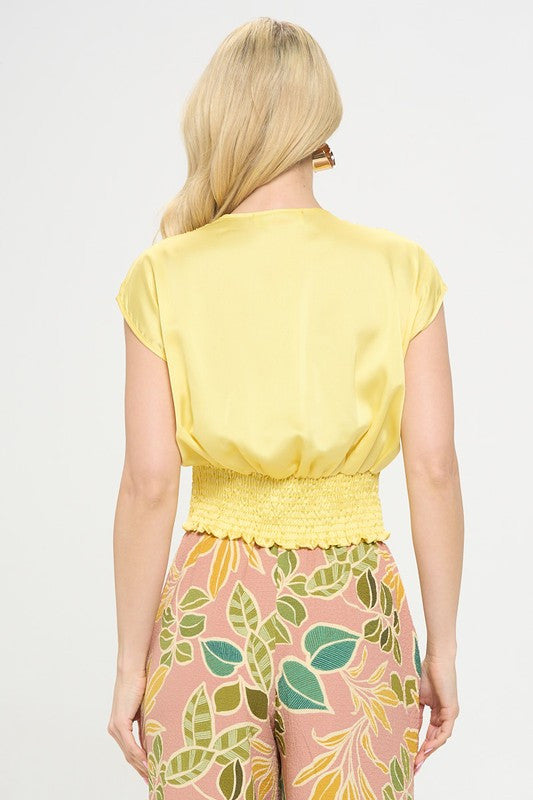 Made in USA Solid Satin V neck Crop Top w Smock Back Detail. Fabric content: 97% Polyester, 3% Spandex.