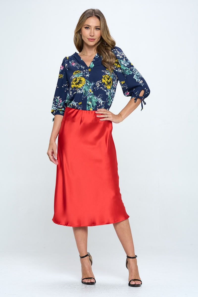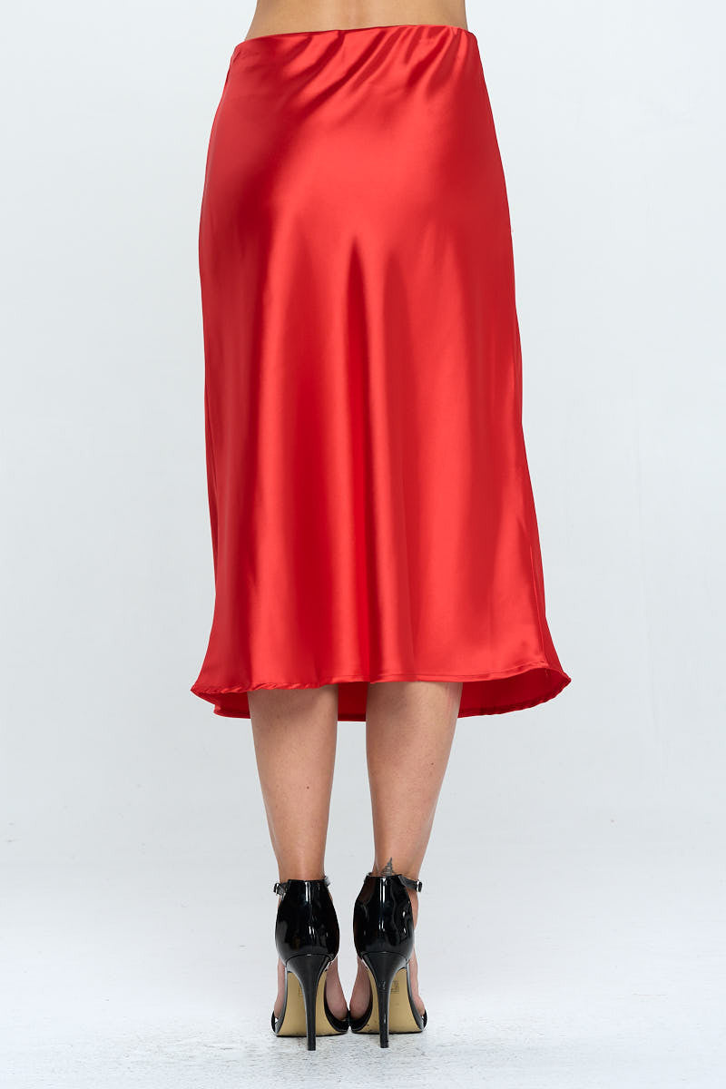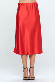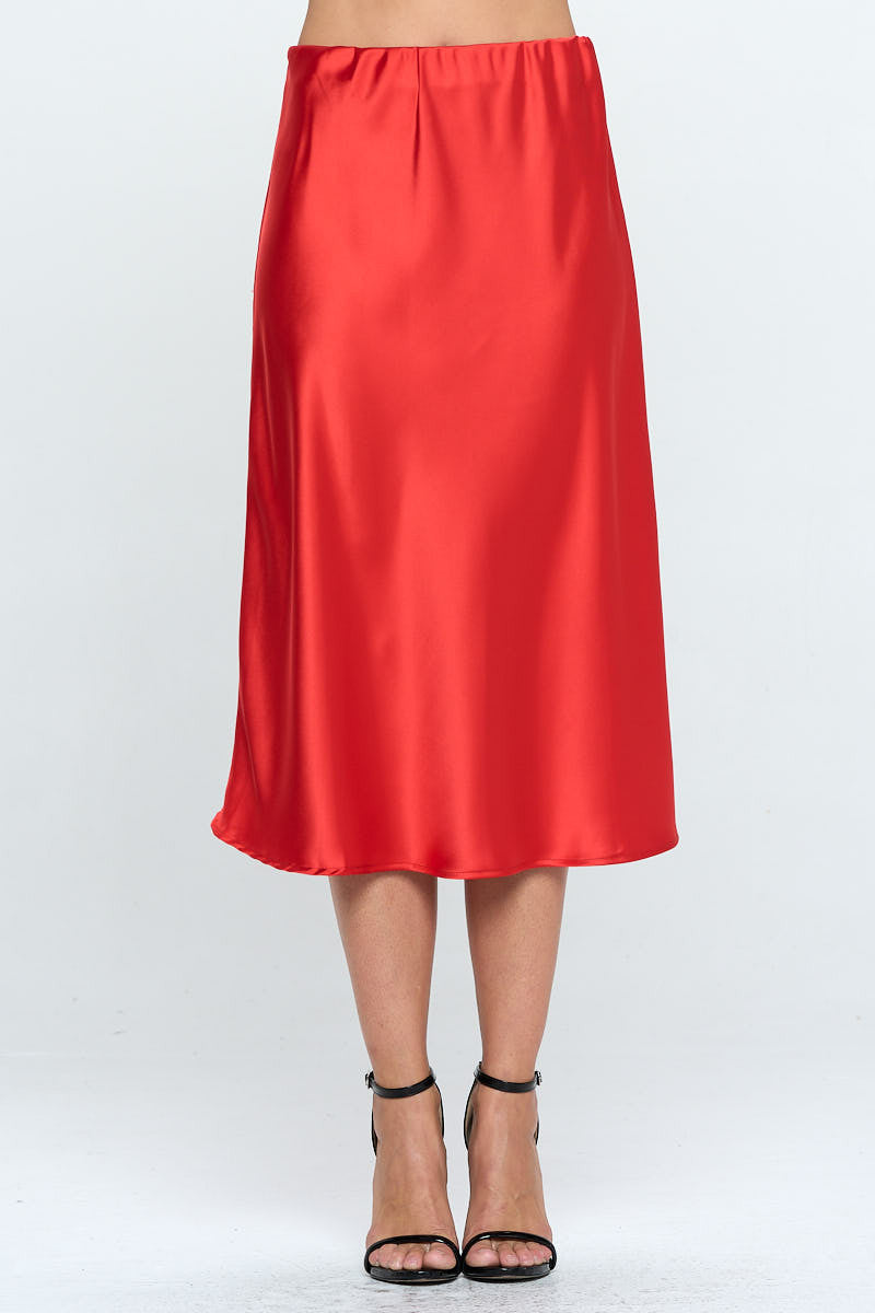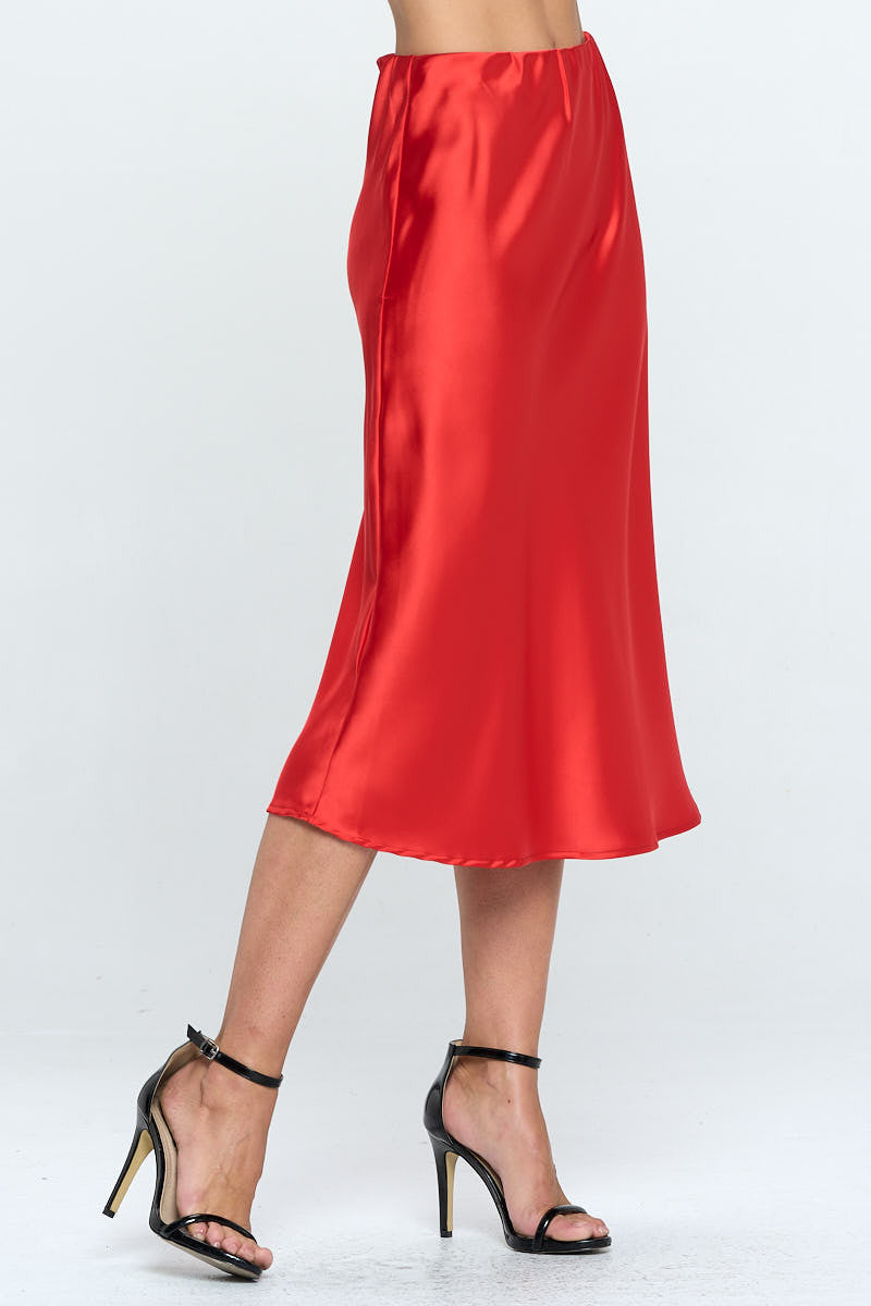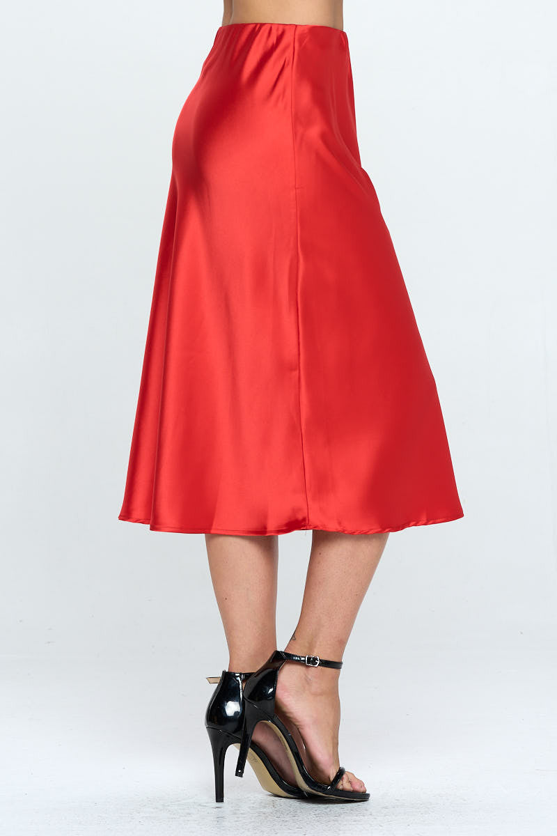 Made in USA Solid Stretch Satin Midi Skirt. Fabric content: 97% Polyester, 3% Spandex. Available in other Colors.