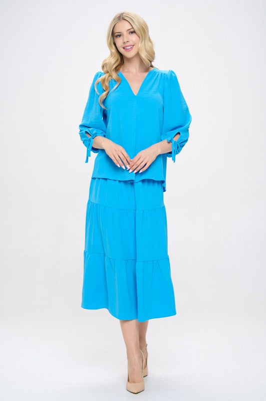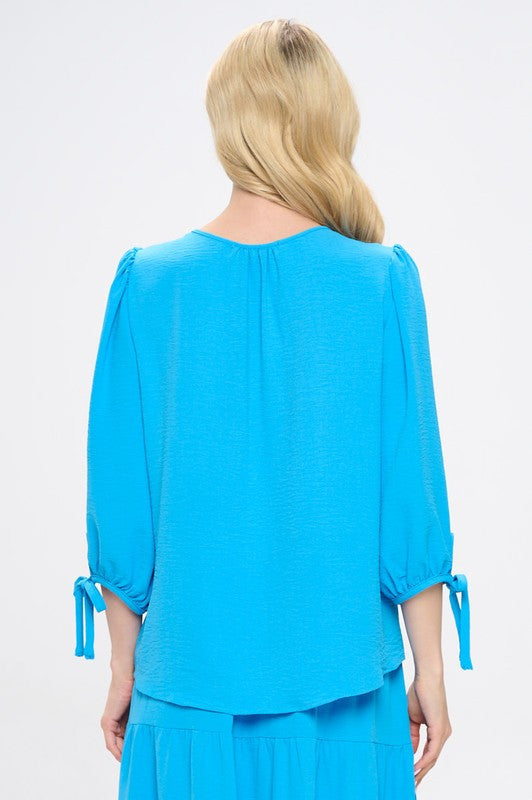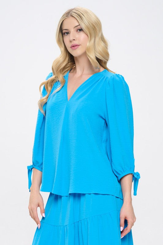 Solid V neck 3/4 Sleeve Top with Sleeve Tie-New Arrival-Reneecollection-Small-BLUE-Urbanheer
